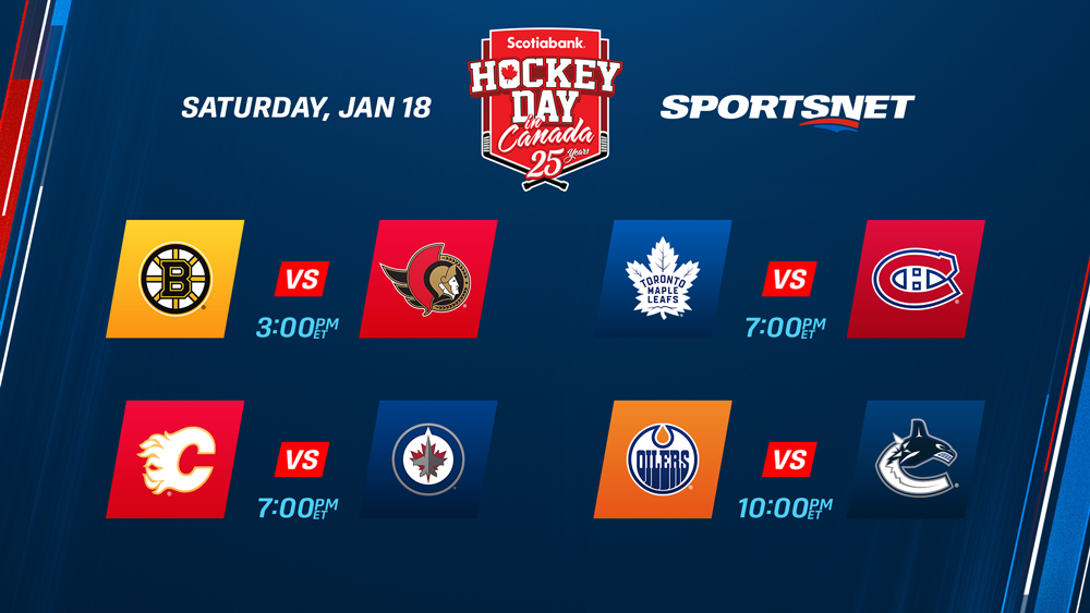 Saturday is set to feature all seven Canadian teams in action during the 25th annual Scotiabank Hockey Day In Canada, with Ron MacLean hosting the day-long celebration from Canmore Golf and Curling Club and Canmore Rec Centre. The event will reach more Canadians than ever before as the day’s coverage will be available in 10 languages: Punjabi, Plains Cree, Mandarin, Cantonese, Hindi, Tagalog, Gujarati, Spanish, ASL and English. Full details of the broadcasting schedule for those languages can be found here. The Bruins-Senators, Maple Leafs-Canadiens and Oilers-Canucks games are also available in French on TVA Sports programming.