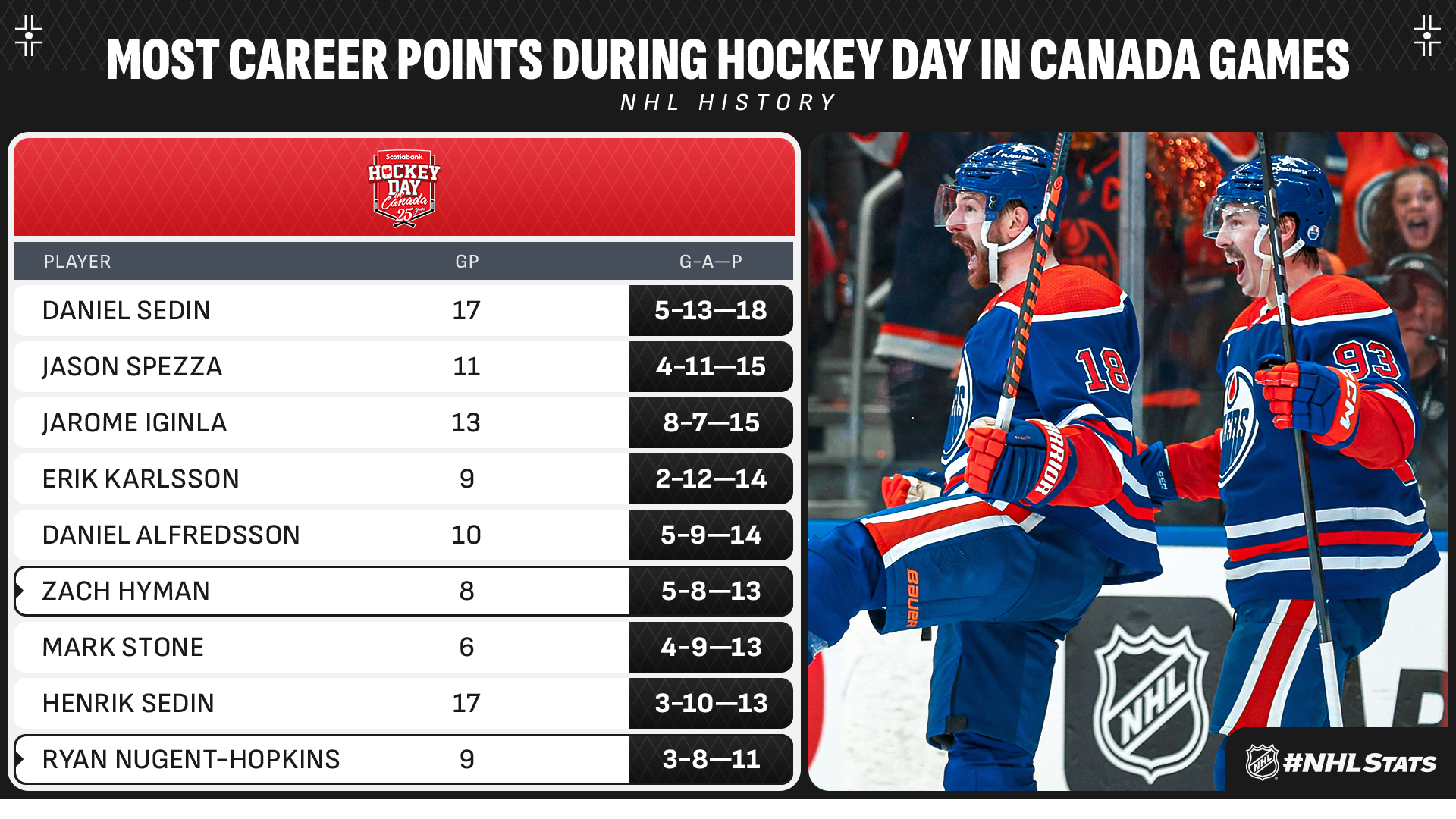 * Zach Hyman and the Oilers (29-13-3, 61 points) joust Jake DeBrusk and the Canucks (19-15-10, 48 points), with Hyman (5-8—13 in 8 GP) and Ryan Nugent-Hopkins (3-8—11 in 9 GP) hoping to add to their notable career totals during Hockey Day in Canada games. Noah Philp, who returned to Edmonton’s lineup Wednesday, was born in Canmore and skated one season with the Alberta Junior Hockey League’s Canmore Eagles in 2014-15.