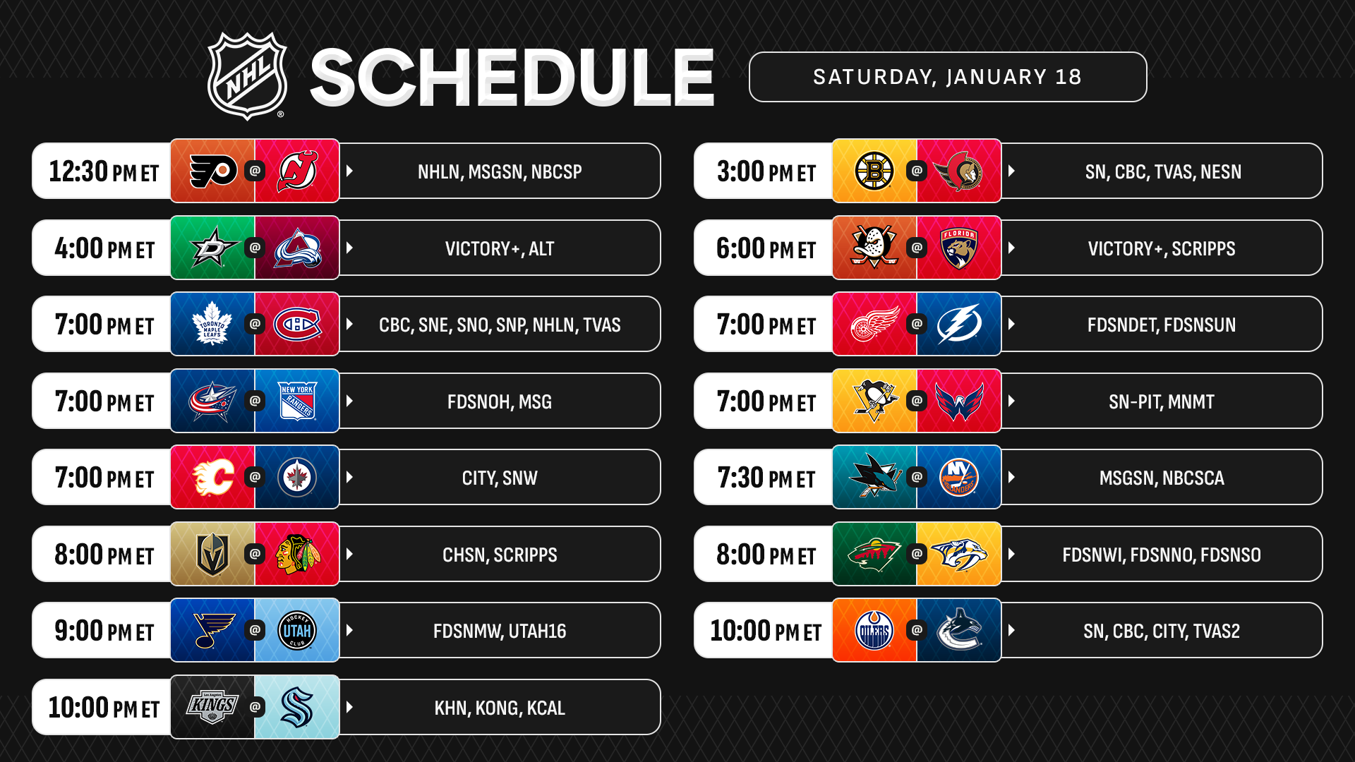 Before Hockey Day in Canada gets underway on Sportsnet, the second straight 15-game Saturday opens with an NHL Network Showcase game when the Devils host the Flyers for the first of three head-to-head meetings in less than two weeks (also Jan. 27 & 29). That’s one of three Metropolitan Division showdowns slated for Saturday, as the Blue Jackets take their six-game winning streak to Madison Square Garden to face the Rangers, while Alex Ovechkin looks to keep The Gr8 Chase rolling at home when the Capitals host Sidney Crosby and the Penguins.