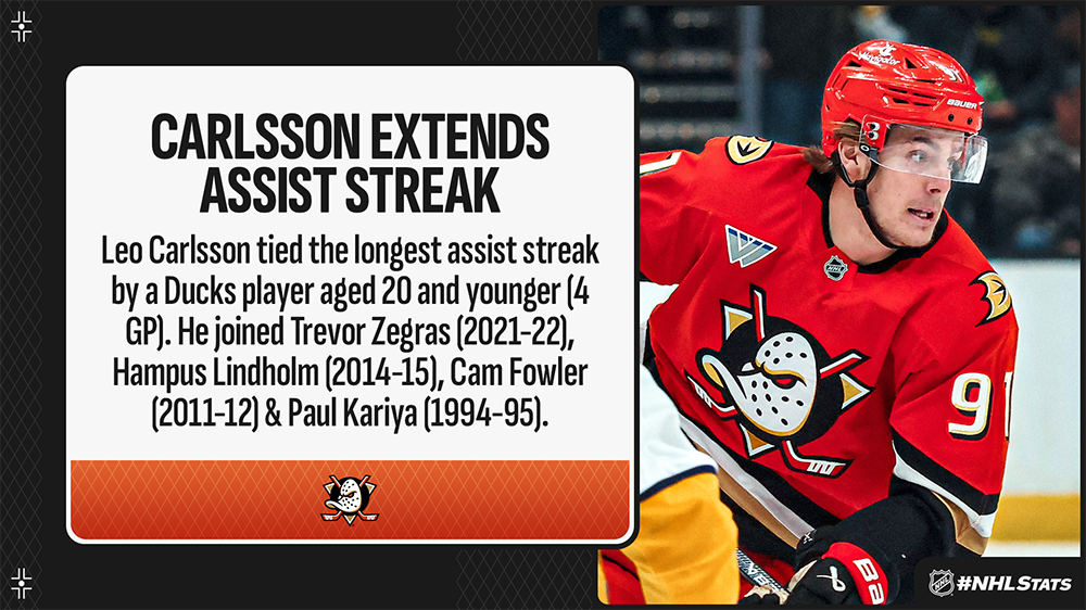 Twelve teams were featured in Friday’s edition of #NHLStats: Live Updates, including Leo Carlsson and the Ducks – Carlsson assisted on Anaheim’s game winner in the third period and became the third Ducks player age 20 or younger to record 60 career points, joining Mason McTavish (76) and Cam Fowler (69).