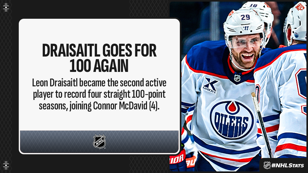* Leon Draisaitl capped Edmonton’s win with the overtime winner and became the second player this season to record 100 points – his fourth consecutive campaign reaching the century mark.