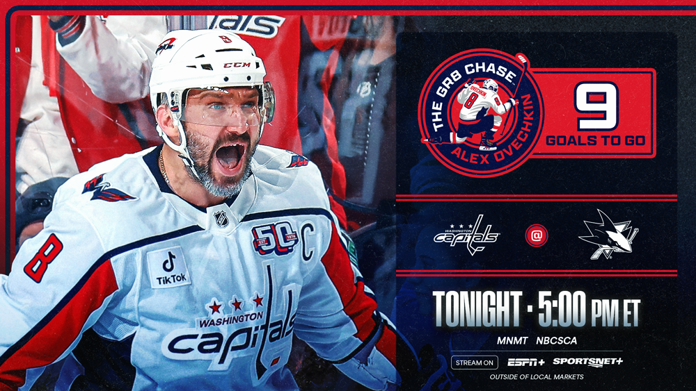 Alex Ovechkin continues The Gr8 Chase in San Jose, when the Eastern Conference-leading Capitals (43-15-8, 94 points) face off against the Sharks (18-40-9, 45 points) – the same team that Wayne Gretzky scored his 800th and 801st career goals against to tie Gordie Howe for the NHL record on March 20, 1994 before surpassing him three days later against the Canucks. Ovechkin (886) enters Saturday just nine goals away from capturing that same record from Gretzky (894)