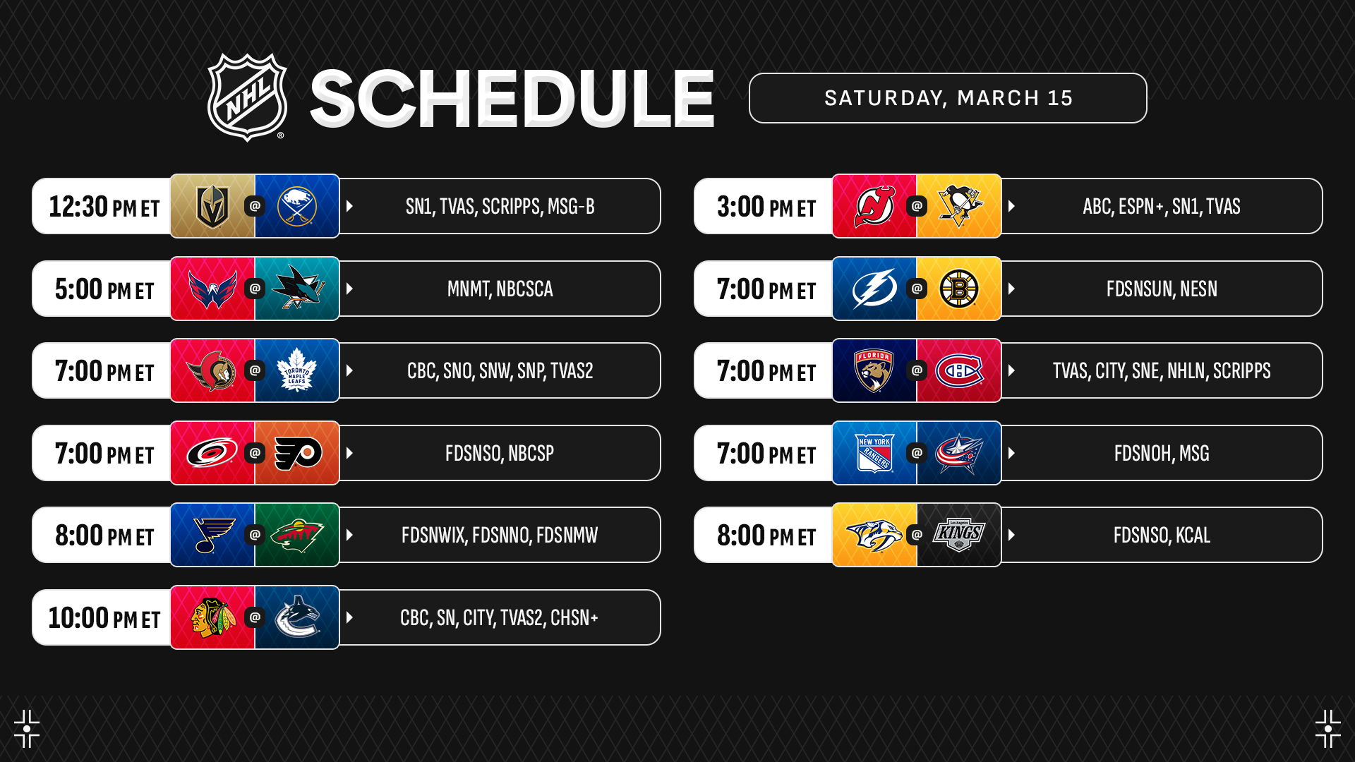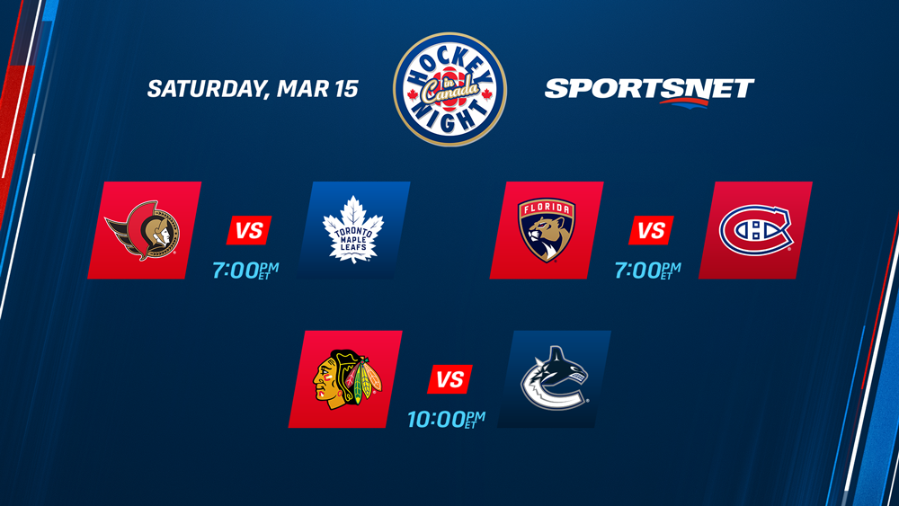 An 11-game Saturday features Sidney Crosby and the Penguins clashing with the Devils in a matinee matchup on ABC, ESPN+, Sportsnet One and TVA Sports as well as several teams in action who are jockeying for position in the Wild Card race with just five weeks remaining until the start of the 2025 Stanley Cup Playoffs. This includes the Canadiens, Senators and Canucks who are set to take the ice on Hockey Night in Canada.