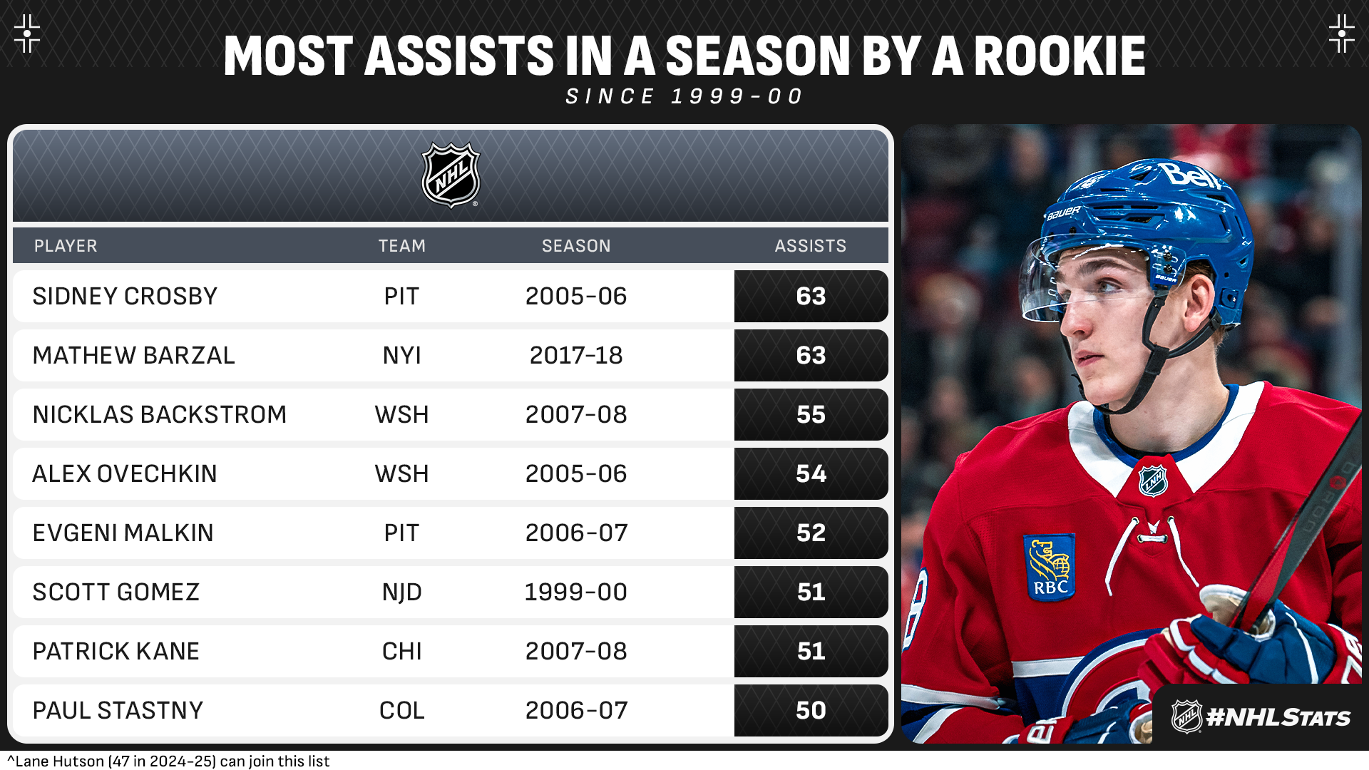 * Lane Hutson (4-47—51 in 65 GP) and the Canadiens (31-27-7, 69 points) enter Saturday looking to jump into the final Wild Card position in the Eastern Conference when they face the Atlantic Division-leading Panthers (41-22-3, 85 points). Hutson, who leads all rookie in points this season, needs three assists to reach 50 in 2024-25 and can become the fifth rookie defenseman in NHL history to reach the mark in a season – he would join Larry Murphy (60 in 1980-81 w/ LAK), Chris Chelios (55 in 1984-85 w/ MTL), Gary Suter (50 in 1985-86 w/ CGY) and Stefan Persson (50 in 1977-78 w/ NYI).