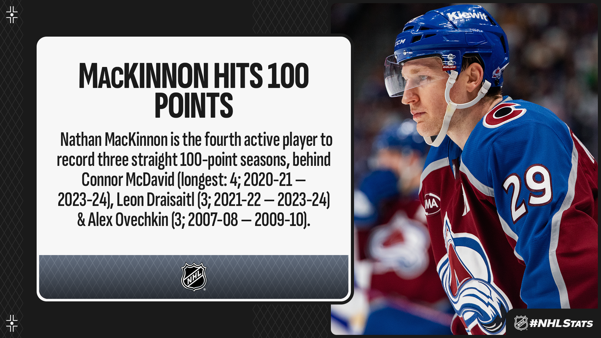 * MacKinnon (27-73—100 in 64 GP) became the second player in franchise history to record three consecutive 100-point seasons, joining Stastny (6x from 1980-81 — 1985-86). He helped the 2024-25 campaign mark the tenth straight of at least one player recording 100, which is the longest run since 1993-94 to 1968-69 (26 seasons).