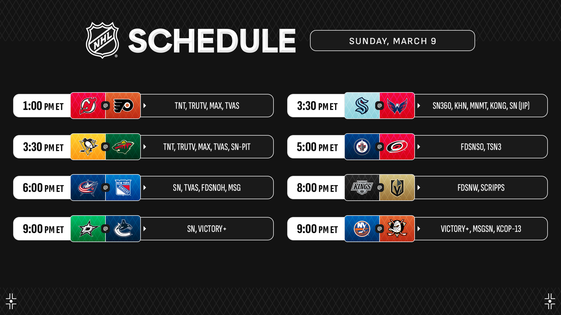 An eight-game Sunday features the continuation of The Gr8 Chase in Washington as well as a pair of nationally broadcast doubleheaders. In the U.S., a two-game set on TNT (truTV) and Max closes with Sidney Crosby and the Penguins visiting the Wild at Xcel Energy Center. In Canada, a doubleheader on Sportsnet begins with the Eastern Conference’s Wild Card race taking center stage as Zach Werenski and the Blue Jackets clash with Artemi Panarin and the Rangers at Madison Square Garden.