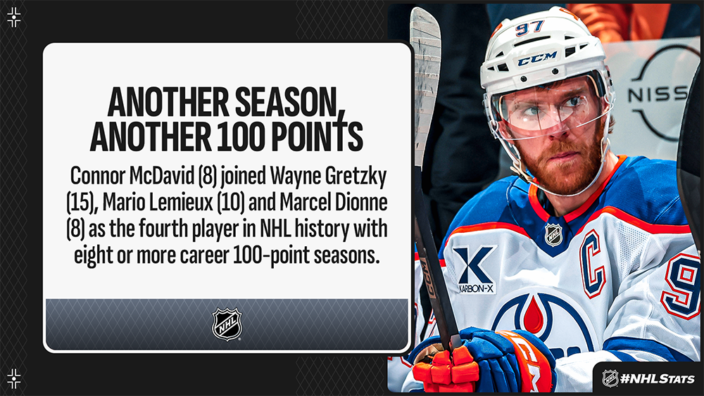 Connor McDavid (0-1—1) returned to the Oilers’ lineup on April 9 and has since concluded his regular season 10 points in his final four games to reach the 100-point mark for eighth time in his career and fifth consecutive time since 2020-21 – a streak that started within a 56-game campaign. The Edmonton captain became the 13th player in NHL history with at least five consecutive 100-point seasons and first since Steve Yzerman extended his run to six in 1992-93.