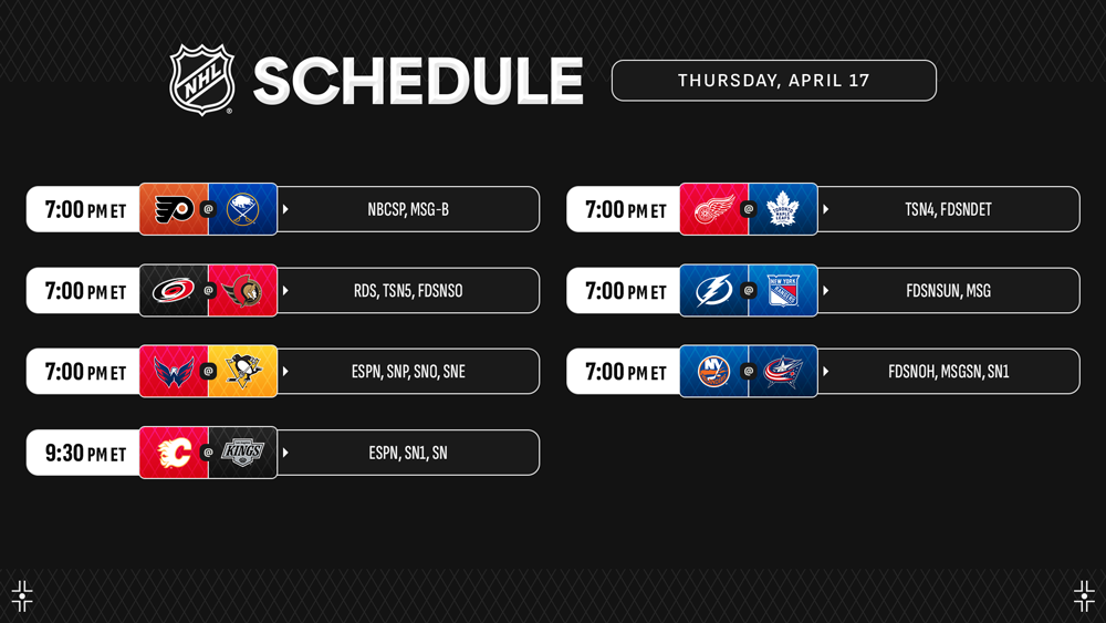 * The NHL announced that Game 1 of the First Round series between the Blues and Jets is scheduled for Saturday, April 19 (6 p.m. ET on TNT, truTV, Max, SN, CBC, TVAS), followed by the Avalanche and Stars opening their postseason matchup later that night (8:30 p.m. ET on TNT, truTV, Max, SN, SN360, TVAS). The complete First Round schedule will be announced when available.
