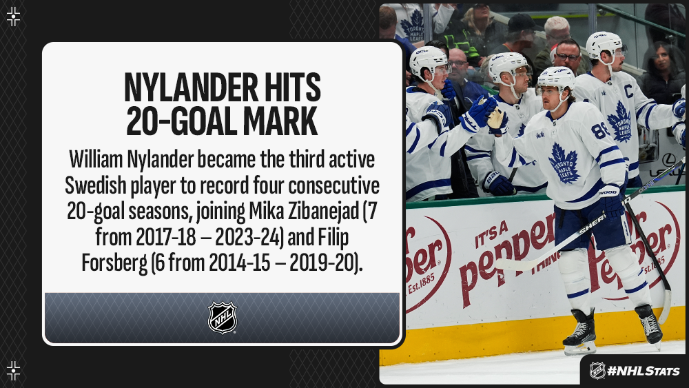 * A pair of players set to skate in the 4 Nations Face-Off in February posted multi-goal games Wednesday, including William Nylander who became the third active Swedish player to record four consecutive 20-goal seasons.