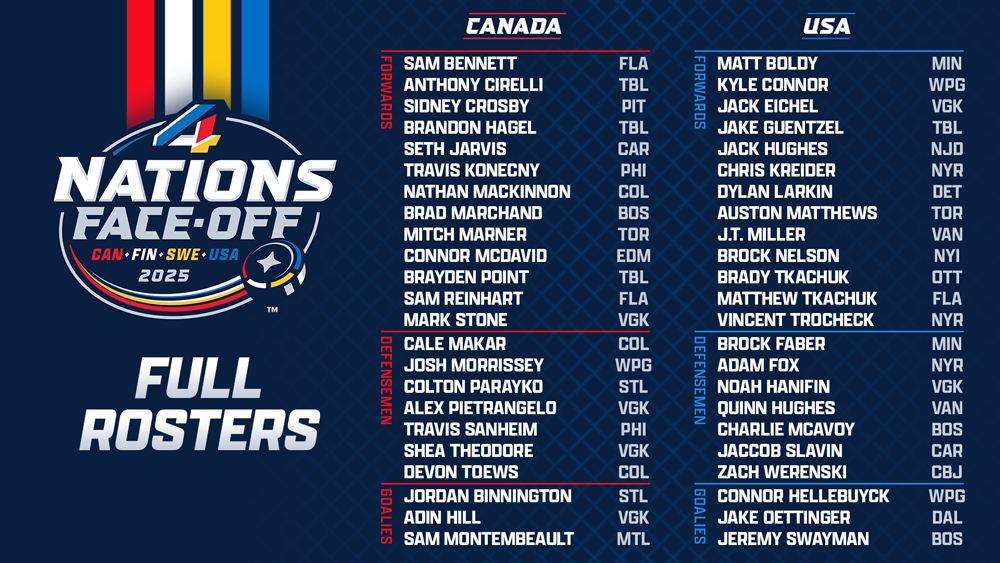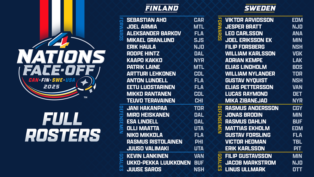 The NHL and NHLPA announced the final 23-player rosters selected by the federations, who will represent Canada, Finland, Sweden and the United States at the 4 Nations Face-Off in February 2025. Click here for By the Numbers: 4 Nations Face-Off Rosters (all stats through Dec. 3, 2024).