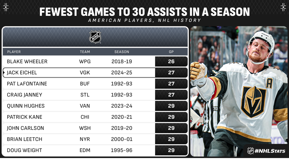 * Eichel (8-30—38 in 27 GP) and Matthews are no strangers to skating side-by-side after last doing so for Team North America at the 2016 World Cup of Hockey. Eichel assisted on both of Shea Theodore’s goals – who will suit up for Canada – and required the second-fewest games by an American player in NHL history to collect 30 assists in a single season, tied with Pat LaFontaine (27 GP in 1992-93) and Craig Janney (27 GP in 1992-93).