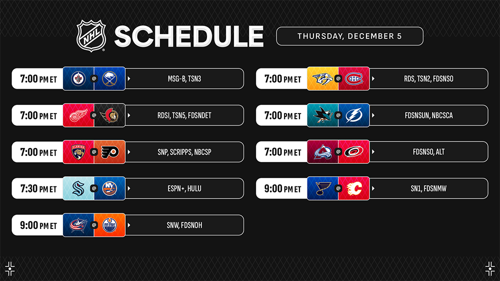 A nine-game slate includes Matty Beniers and the Kraken (12-13-1, 25 points) visiting Brock Nelson and the Islanders (9-10-7, 25 points) exclusively on ESPN+ and Hulu as well as Jordan Kyrou and the Blues (12-12-2, 26 points) in action against Nazem Kadri and the Flames (13-9-4, 30 points) on SN1 in Canada.