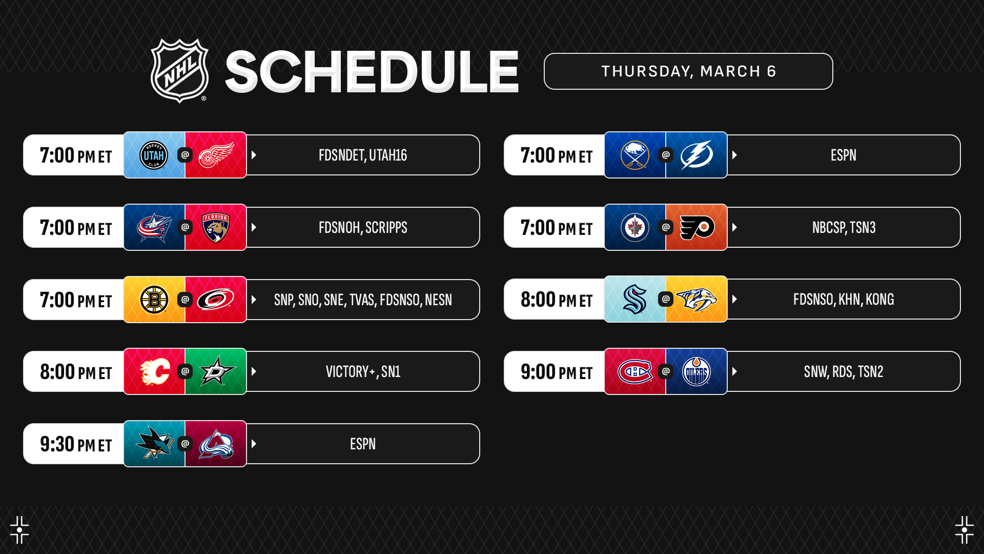 Thursday’s nine-game slate is headlined by an ESPN doubleheader featuring Rasmus Dahlin and the Sabres (24-30-6, 54 points) visiting Victor Hedman and the Lightning (36-21-4, 76 points) at Amalie Arena followed by Nathan MacKinnon and the Avalanche (36-24-2, 74 points) hosting Macklin Celebrini and the Sharks (17-37-9, 43 points) at Ball Arena. NHL Coast to Coast, the weekly studio show featuring live look-ins, highlights and expert analysis of every contest, also returns on Prime Video Canada starting at 7 p.m. ET.