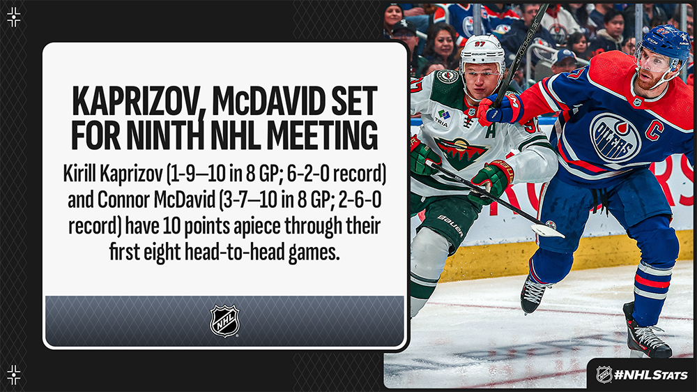 * Kaprizov carries a career-high 10-game road point streak into Thursday and can record the longest run in franchise history, eclipsing Joel Eriksson Ek (10 GP from Dec. 31, 2022 to Feb. 8, 2023) and Eric Staal (10 GP from Dec. 4, 2016 to Jan. 14, 2017). Kaprizov (13-20—33 in 18 GP) collected two goals during Minnesota’s victory versus St. Louis on Tuesday and sits one point back of Nathan MacKinnon (7-27—34 in 19 GP) for the League lead in scoring this season, while McDavid (9-15—24 in 17 GP) mustered his 126th career three-point game that night as No. 97 moved into a tie with Lanny McDonald for 97th place on the NHL’s all-time scoring list.