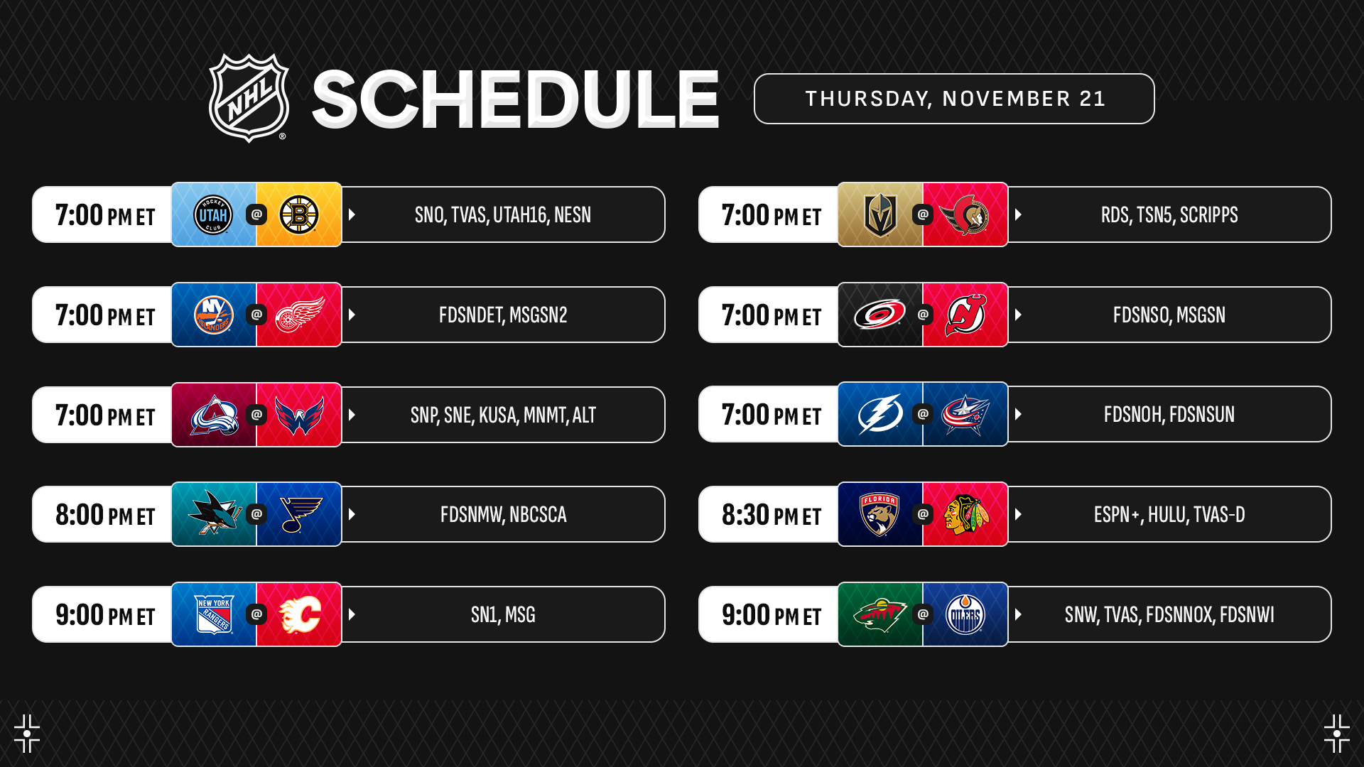* More highlights include Connor Bedard and the Blackhawks battling the reigning Stanley Cup champions on ESPN+; MacKinnon looking to maintain his NHL-leading point total on Sportsnet programming; Joe Sacco serving his first game as Bruins’ head coach on TVA Sports; as well as Macklin Celebrini and the Sharks squaring off with the Blues in San Jose’s final game before retiring Joe Thornton’s No. 19. St. Louis and Chicago continue down the path to meeting at Wrigley Field in the Discover NHL Winter Classic on Dec. 31 (5 p.m. ET on TNT, truTV, MAX, SN, TVAS), with the NHL and Fanatics unveiling the Winter Classic jersey for both clubs Wednesday.
