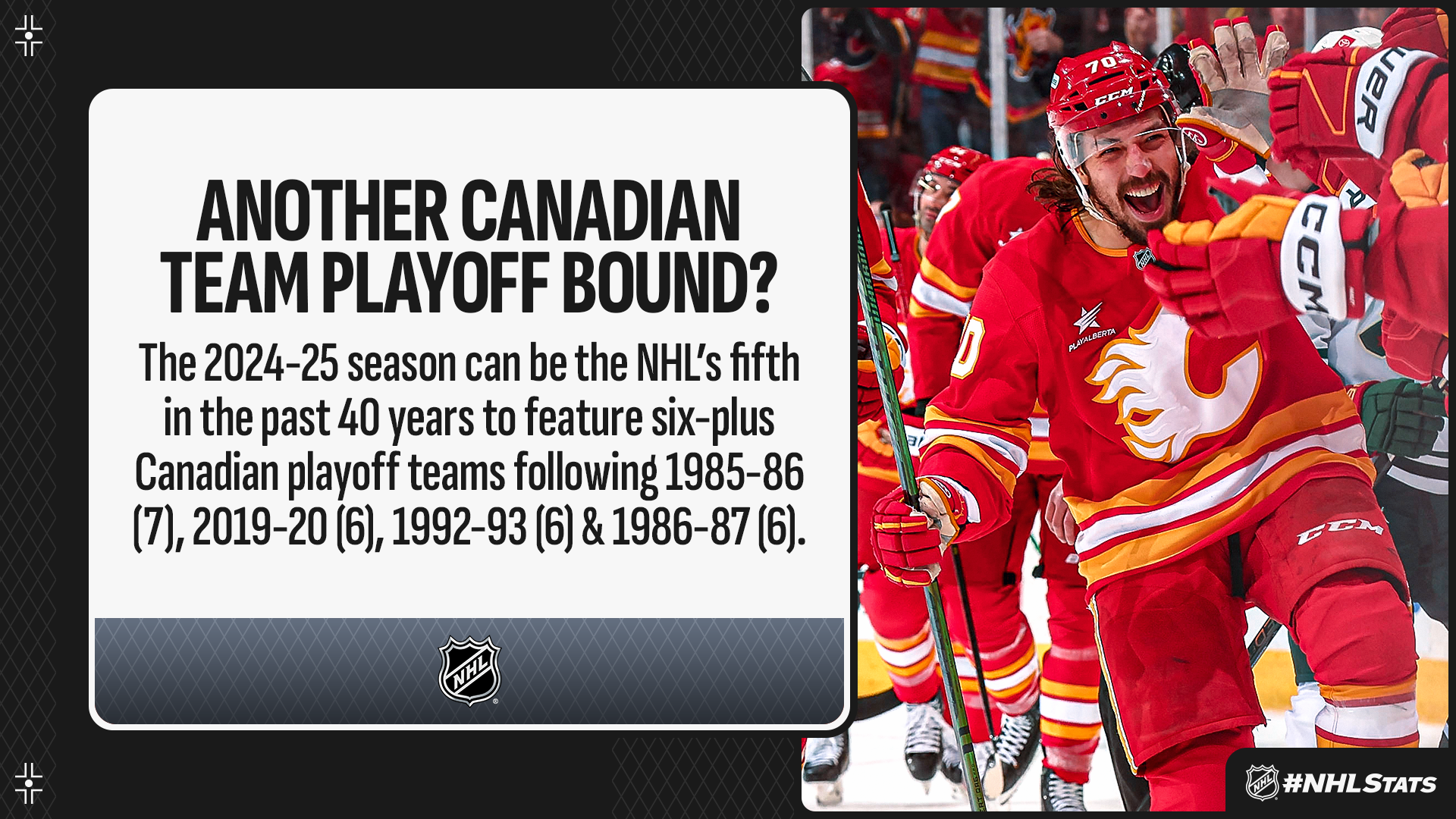 * The Flames sit one victory shy of their first 40-win season since 2021-22 (50) – a campaign that also featured the franchise’s last Stanley Cup Playoffs appearance. Should Calgary and Montreal clinch a postseason berth, it would boost the NHL’s Canadian postseason representation to six clubs. Overall, the 312 combined wins by Canadian-based teams this season are the most in one campaign in NHL history and eight more than the next-closest (304 in 1992-93).