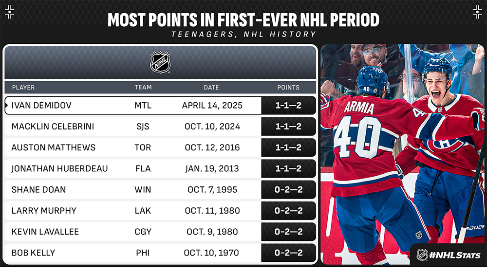 * Ivan Demidov joined a short list of teenagers to record multiple points in their first-ever NHL period and a shorter franchise list of teenagers to score in their Canadiens debut as Montreal earned a crucial point in the Eastern Conference Wild Card race.