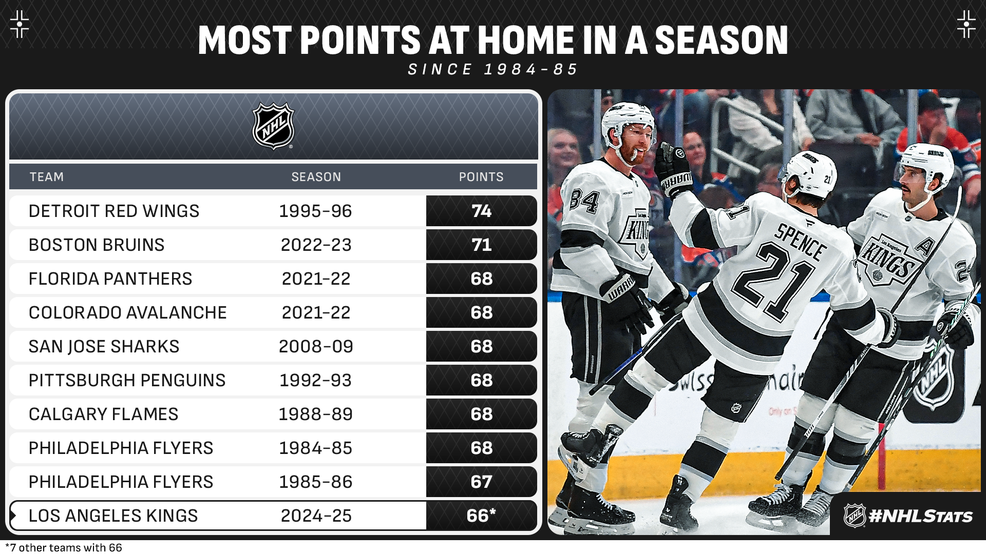 * Los Angeles tied its second-most wins in a season in franchise history (also 47 in 2022-23), behind only 2015-16 (48) – success that has largely benefitted from their play at Crypto.com Arena. The Kings won 78% of home games in 2024-25, with their 31 victories on home ice their most in a campaign in franchise history and tied for the most among all teams in 2024-25 (also CAR w/ 31). Los Angeles will have an opportunity to surpass Carolina when it closes out the season at Crypto.com Arena on April 17 and could climb the list of most home points in a season over the past 40 years.