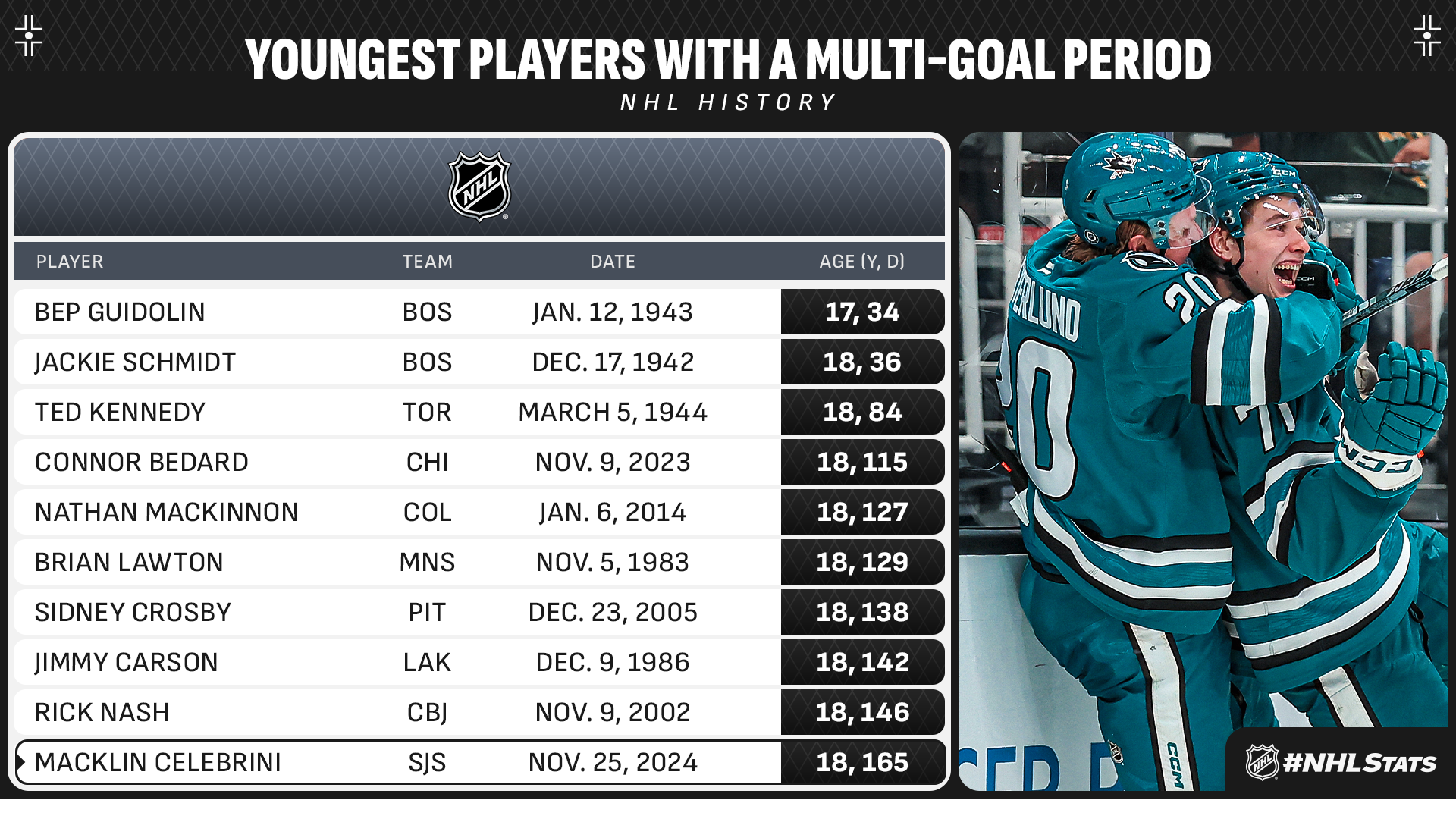 * Trailing 2-1, Macklin Celebrini (2-1—3) factored on three of San Jose’s next six goals, including scoring two in the third period, and became the second 18-year-old in franchise history with a three-point game, joining Patrick Marleau (March 5, 1998). Only five players in the past 15 years have recorded a three-point outing at a younger age than Celebrini (18 years, 165 days), while just three active players have tallied twice in a period at a younger age (Connor Bedard, Nathan MacKinnon & Sidney Crosby).