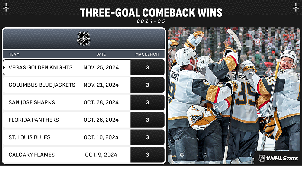 The Sharks, Senators, Golden Knights, Blues and Jets were five of 10 teams to earn a comeback win during Monday’s 11-game slate, matching the highest total on a single day since Oct. 24, 2023. The only day in NHL history to feature more was Oct. 29, 2005 (11).