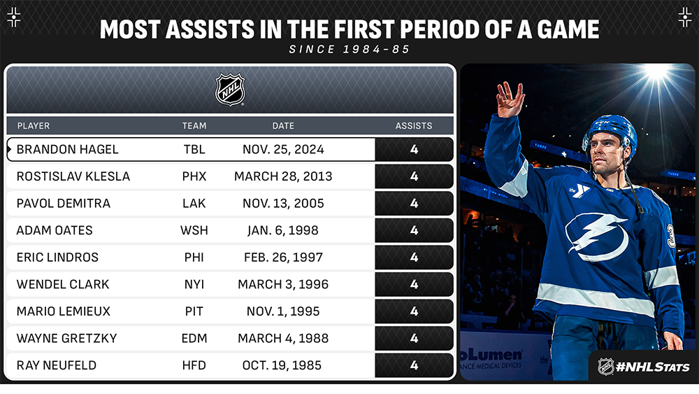 Brandon Hagel (0-5—5) collected four of his franchise-record tying five assists in the first period to match the NHL benchmark for most in an opening frame – achieved by eight others in the past 40 years – and helped the Lightning (11-7-2, 24 points) join the Senators as the second team with multiple eight-goal performances this season.