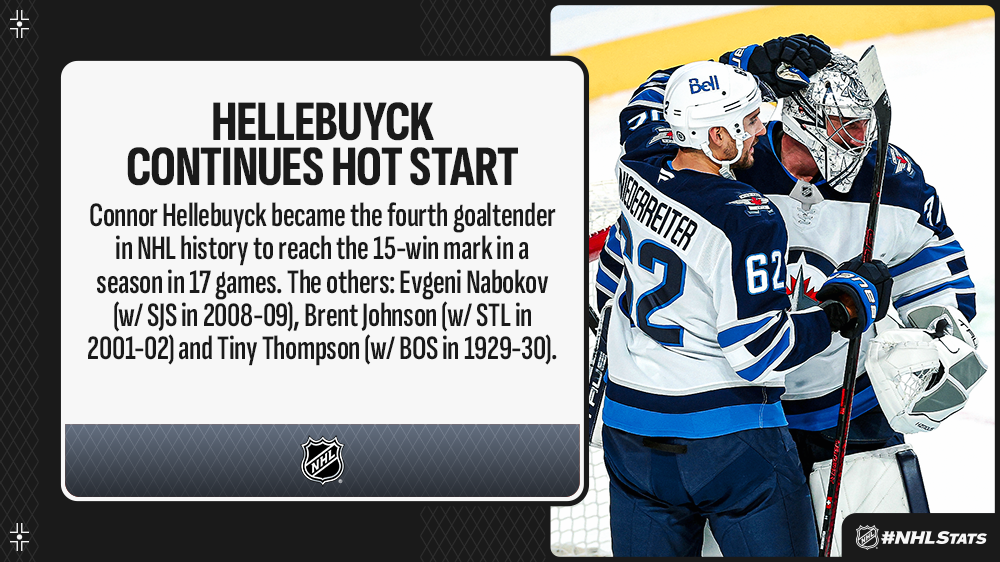 * Connor Hellebuyck (43 saves) recorded his first 40-save performance of the season en route to his 15th win of 2024-25. Hellebuyck helped the Jets (18-4-0, 36 points) gain a six-point edge over the Wild (13-4-4, 30 points) for top spot in the Western Conference as Winnipeg won its seventh straight contest against Minnesota dating to April 11, 2023 – the club’s second-longest run versus one opponent (8 GP vs. ANA).