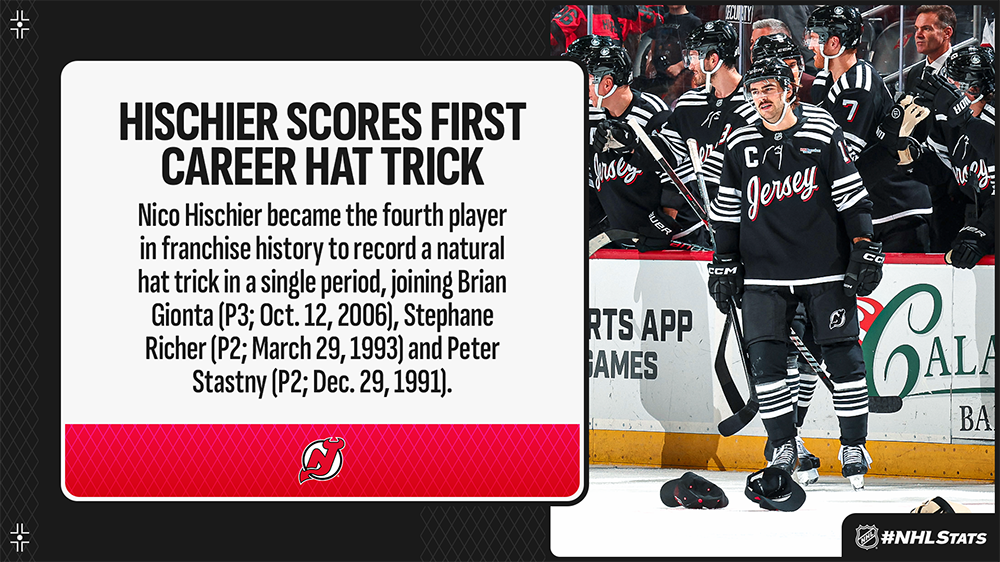 Nico Hischier scored a hat trick – with all three goals coming in consecutive fashion during the second period – to help lift the Devils to a third straight victory and an NHL-best 8-2-0 record over their past 10 games. The New Jersey captain became the fourth player in the past 15 years to score a natural hat trick with the club, alongside Jack Hughes (Nov. 26, 2022), Brian Boyle (Nov. 5, 2018) and Michael Cammalleri (Nov. 6, 2016).