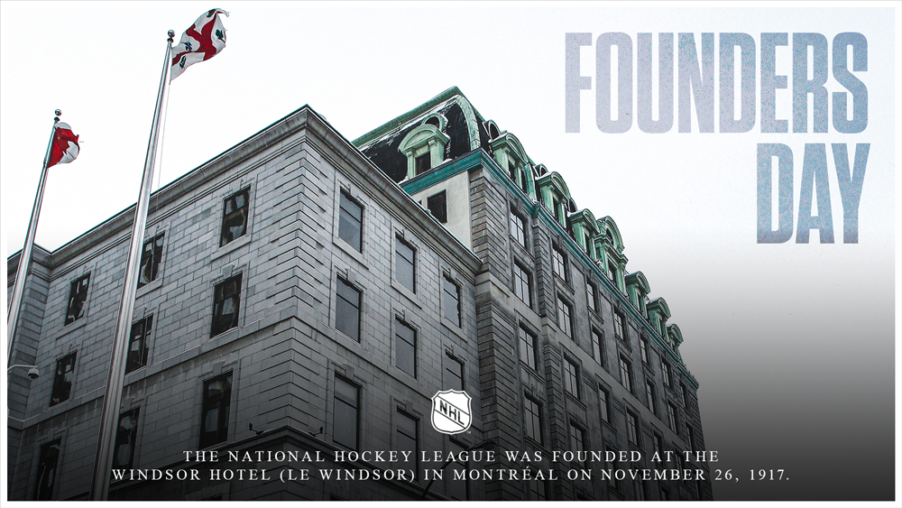* The National Hockey League was founded on Nov. 26, 1917, at the Windsor Hotel in Montreal, following three days of meetings involving owners from the National Hockey Association – which had suspended operations weeks earlier. As noted in the meeting minutes, the owners decided “that the Canadiens, Wanderers, Ottawa and Quebec Hockey Clubs unite to comprise the National Hockey League.”