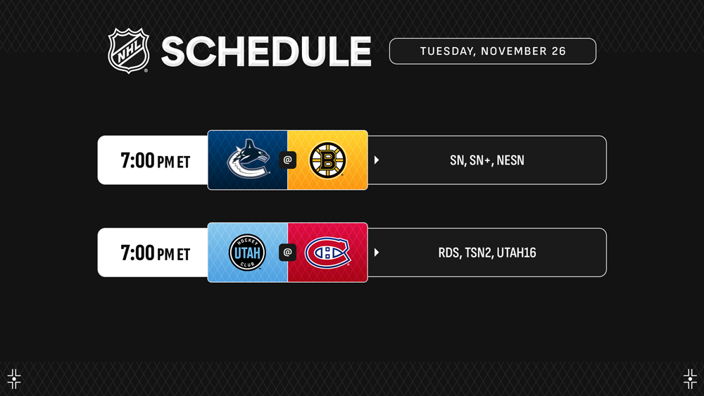 On the 107th anniversary of the National Hockey League’s founding, two of its more historic franchises will host the only games Tuesday. In Montreal, the NHL’s oldest franchise, the Canadiens, welcome its newest franchise, the Utah Hockey Club, to the city where the League was officially founded. In Boston, the NHL’s first U.S.-based franchise, the Bruins, will be visited by the Canucks, the team they defeated to win their most recent Stanley Cup in 2011. On Dec. 1, the Canadiens will visit the Bruins for Boston’s Centennial Game, marking the 100-year anniversary of the franchise’s first game against the Montreal Maroons on Dec. 1, 1924.