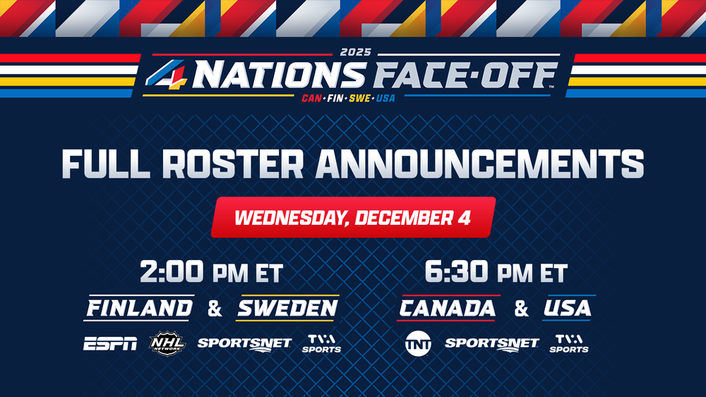 The full rosters for the 4 Nations Face-Off will be unveiled today. Beginning at 2 p.m. ET, the remaining players representing Finland and Sweden will be announced on a live show produced by NHL Network and made available globally, as well as on TVA Sports and ESPN during the 2 p.m. ET edition of SportsCenter. At 6:30 p.m. ET, the balance of rosters for Canada and the United States will be announced during live pre-game shows on Sportsnet, TNT and TVA Sports leading into Wednesday’s four-game slate. For more information, click here.