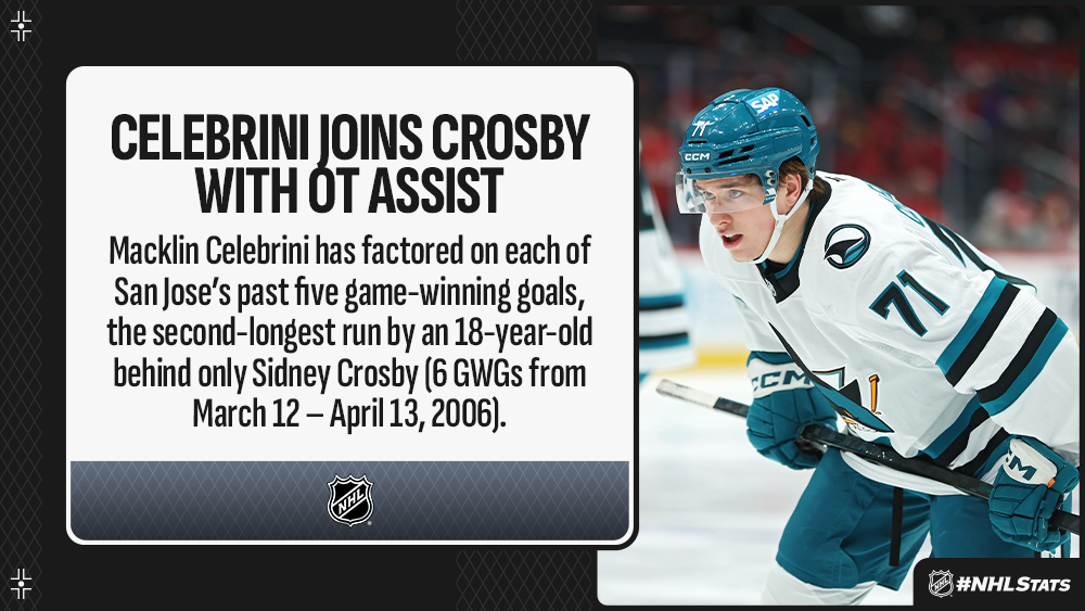 * Macklin Celebrini assisted on William Eklund’s overtime goal to help San Jose (10-13-5, 25 points) win its third straight game. Celebrini, who has tallied 4-4—8 over his past five games, tied Pat Falloon (5 GP in 1991-92) for the second-longest point streak by a teenager in franchise history and trails only Jeff Friesen (6 GP in 1994-95).