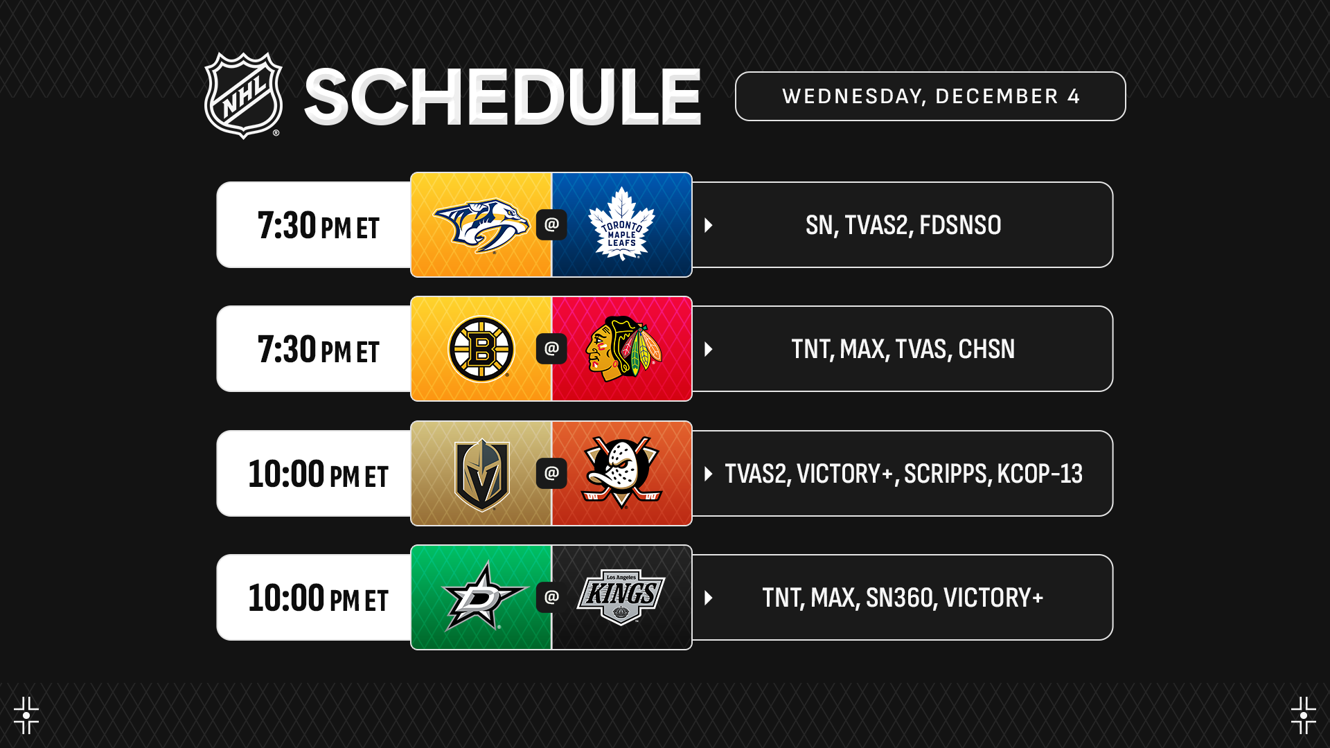 * Wednesday night hockey will feature the Maple Leafs and Predators on Sportsnet, before a TNT and Max doubleheader pits the Bruins-Blackhawks and Stars-Kings. The latter broadcast will also premiere Road to the Discover NHL Winter Classic presented by Enterprise at 6 p.m. ET ahead of the action on the ice.