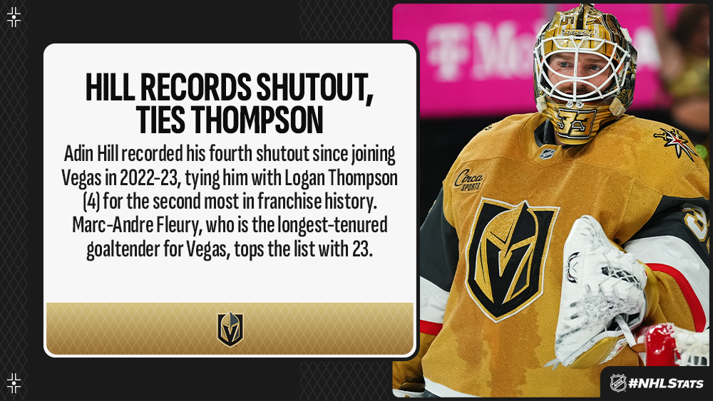 * Ivan Barbashev’s team-leading 13th goal of the season was the lone tally at T-Mobile Arena as Adin Hill made 28 saves for his ninth career shutout and fourth with the Golden Knights. Of the 404 games played this season, Vegas’ victory marked the 304th to be decided by a one-goal margin, or by two following at least one empty-net goal (75.2%) – that percentage is the highest in NHL history through this stage of a campaign (404 GP).