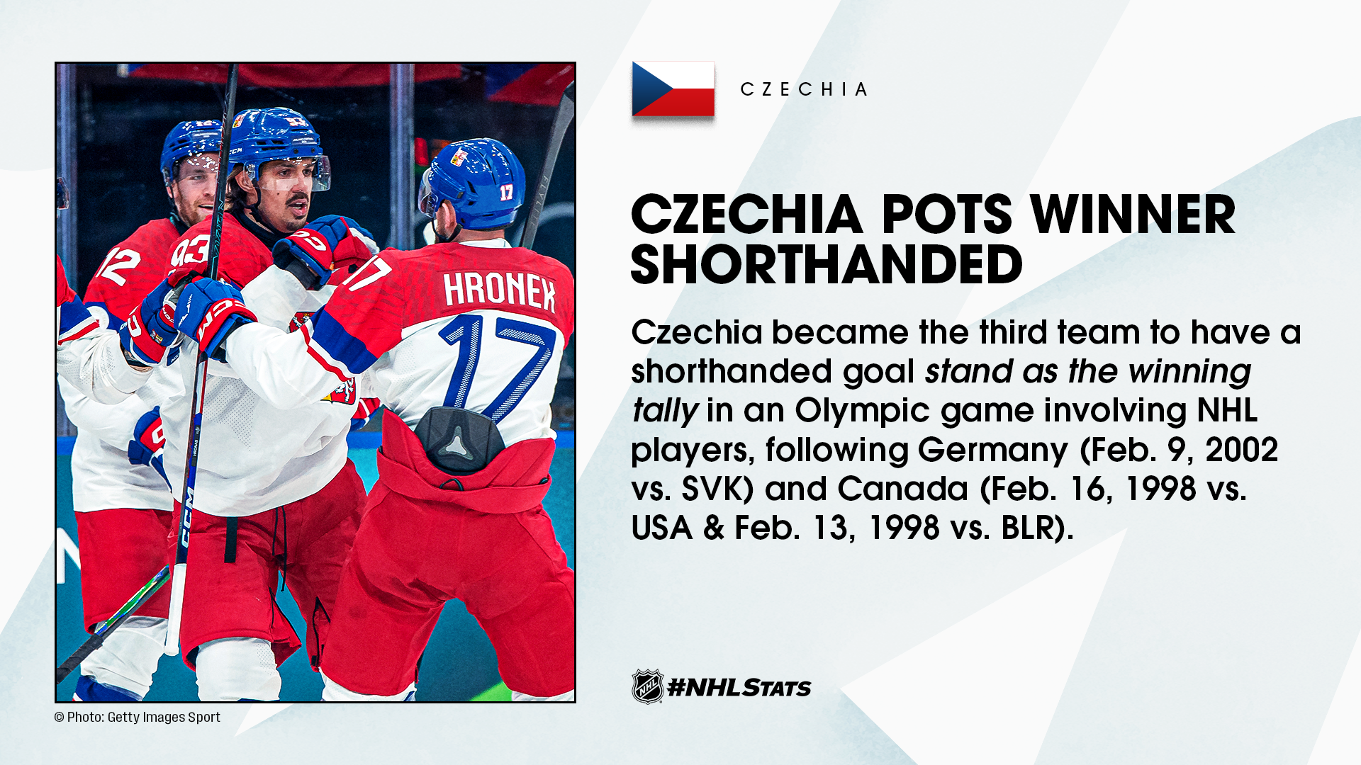 * Necas and Pastrnak were two of four Czech NHL players to pick up two points against France, marking the second time Czechia has had at least that many record multiple points in an Olympic game involving NHL players, following Feb. 15, 2002. The other two were Stars forward Radek Faksa (0-2—2) and Canucks defenseman Filip Hronek (0-2—2), who helped set up Czechia’s fifth shorthanded goal in Olympics with NHL player participation.