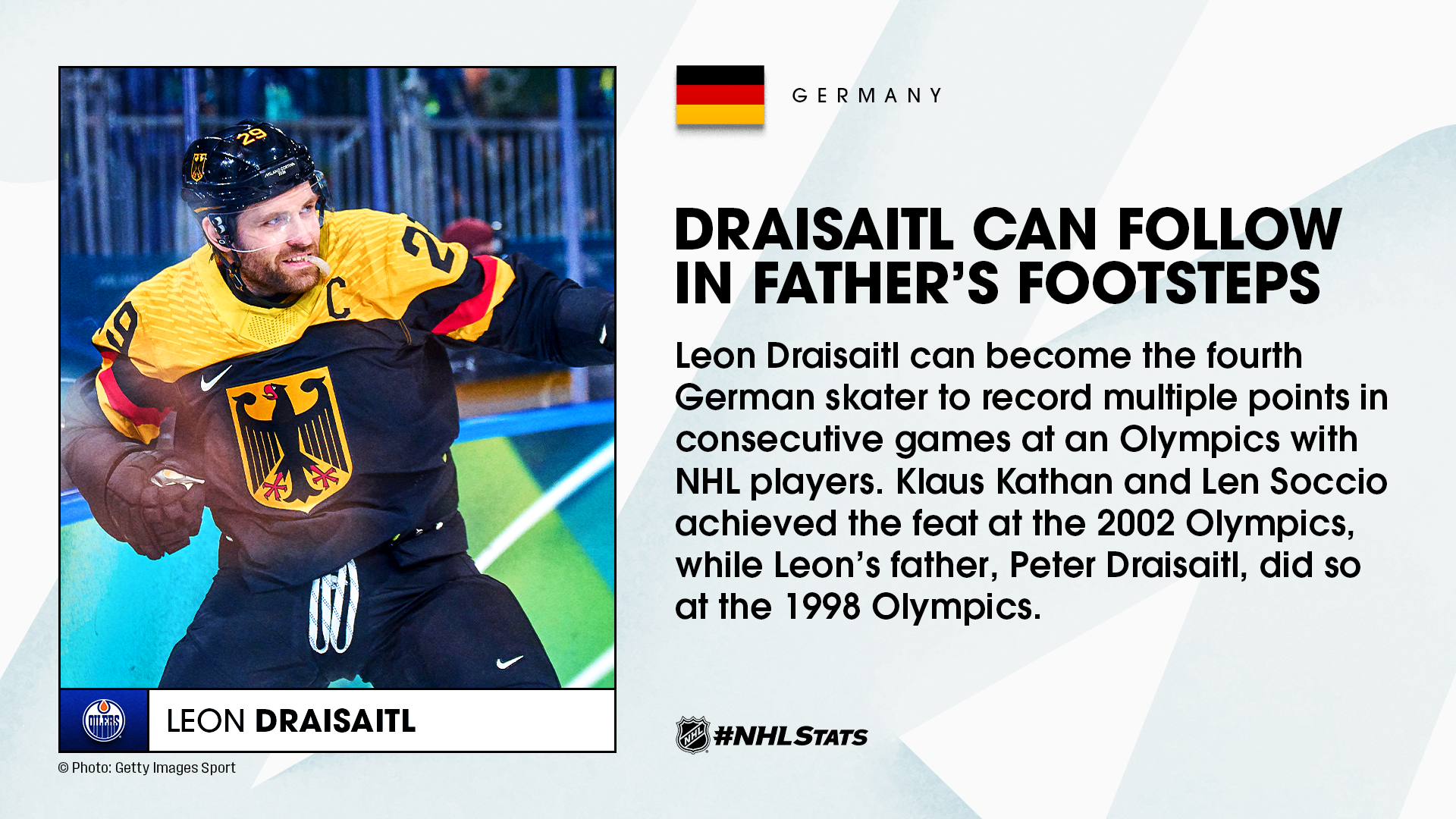 * Oilers forward Leon Draisaitl and Senators forward Tim Stützle, who posted two points apiece in Team Germany’s opening game of the tournament, can each achieve notable feats with another multi-point outing against Team Latvia. Stützle can become the first German skater to score multiple goals in consecutive games at an Olympic tournament involving NHL players, while Draisaitl can follow in the footsteps of his father, Peter Draisaitl.