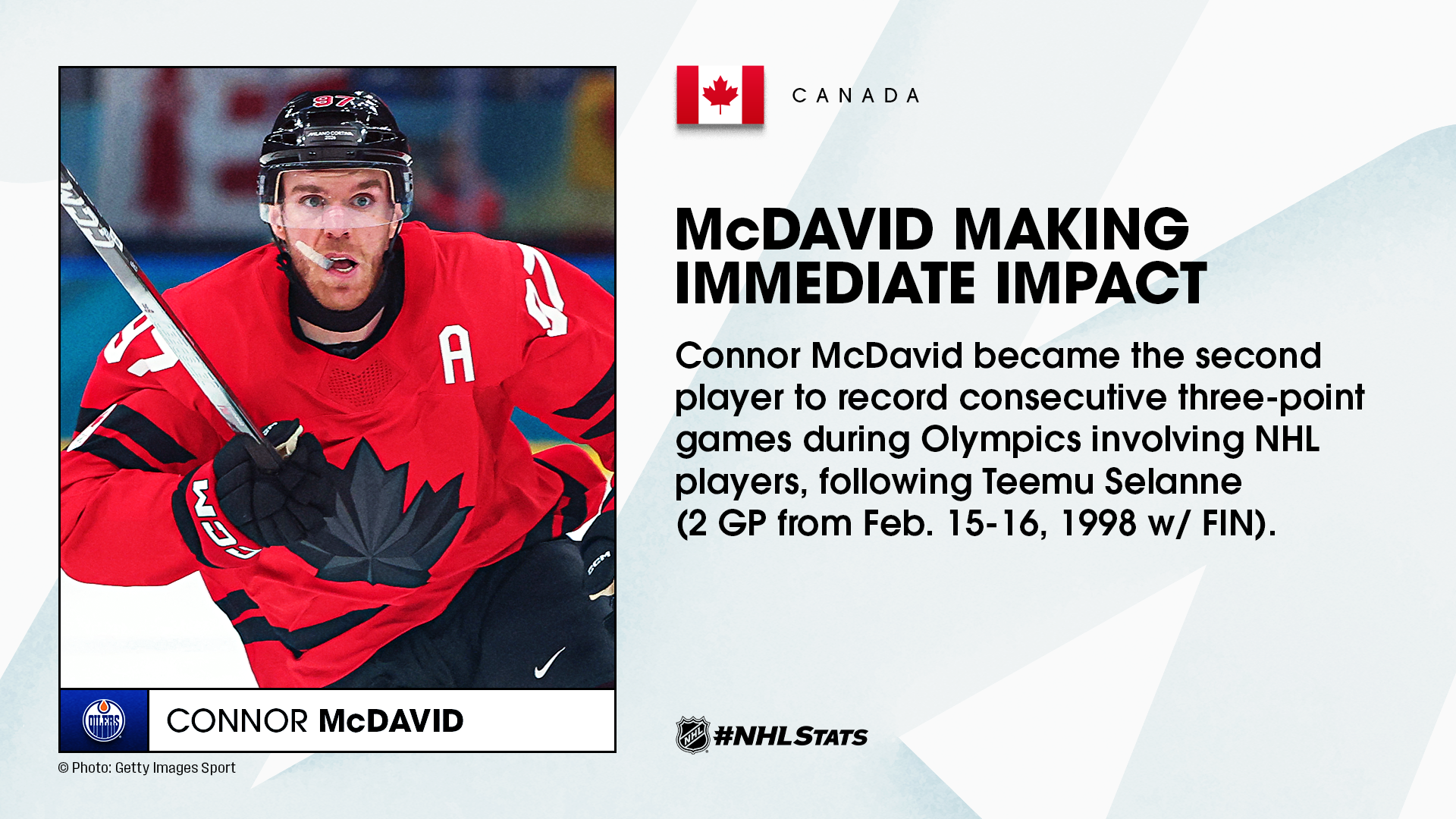 * McDavid became the third Team Canada skater to record multiple three-point games in Olympics involving NHLers, joining Jarome Iginla (Feb. 16, 2010 & Feb. 24, 2002) and Joe Sakic (Feb. 24, 2002 & Feb. 16, 1998). The Oilers captain (1-5—6) also surpassed Marian Hossa (2-3—5 in 2006 w/ SVK) and Teemu Selanne (4-1—5 in 2006 w/ FIN) for the most points through their team’s first two games of an Olympic tournament with NHL participation.