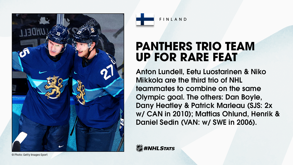 * Panthers trio Anton Lundell,Eetu Luostarinen and Niko Mikkola combined to help Team Finland defeat rival Team Sweden in an Olympics with NHL participation for the first time since 1998.