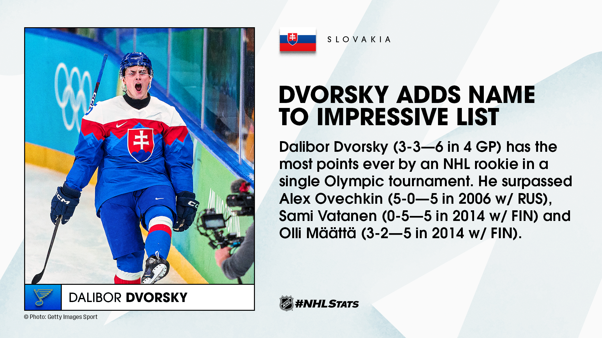* Dvorsky improved his totals to 3-3—6 to establish the most points ever by an NHL rookie and by any Blues player in a single Olympics involving NHL players, surpassing Alexander Steen (1-3—4 in 2014 w/ SWE), David Backes (3-1—4 in 2014 w/ USA) and Scott Young (4-0—4 in 2002 w/ USA). Twenty-year-old Dvorsky also became the third-youngest player to record a point streak of four-plus games at an Olympics with NHL players, behind Macklin Celebrini in 2026 (4 GP at age 19 w/ CAN) and Evgeni Malkin in 2006 (4 GP at age 19 w/ RUS).