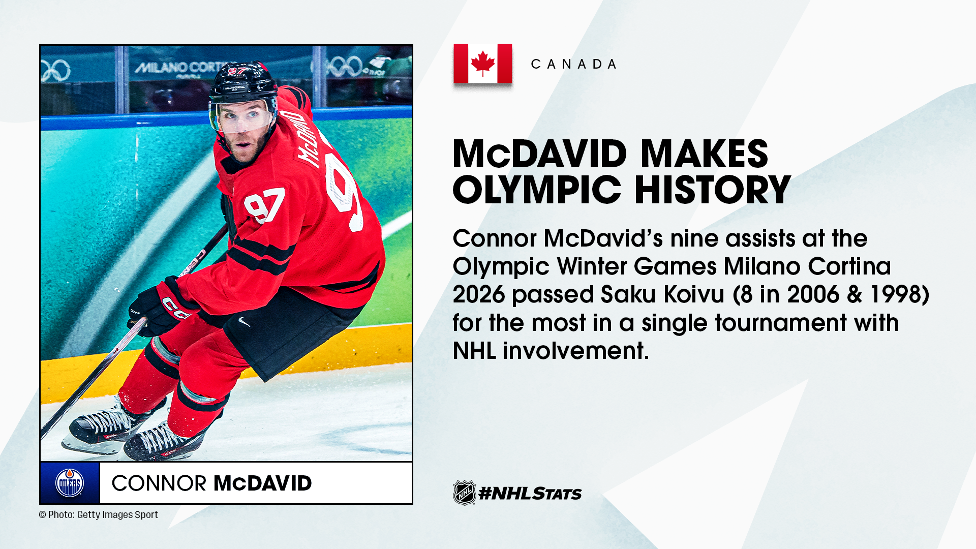 * Celebrini extended his goal streak to four games and became the second teenager to score in an Olympic elimination game involving NHL players (also Olli Määttä in 2014 BMG). Celebrini also registered his second three-point game in Milan, boosting his tournament totals to 5-4—9 (4 GP) to break a tie with Evgeni Malkin (2006: 2-4—6 in 7 GP) for the most points by a teenager at an Olympics with NHL participation. Meanwhile, McDavid posted his fourth consecutive multi-point game – tied with Teemu Selanne (4 GP in 1998) for the longest streak in an Olympics with NHL players.