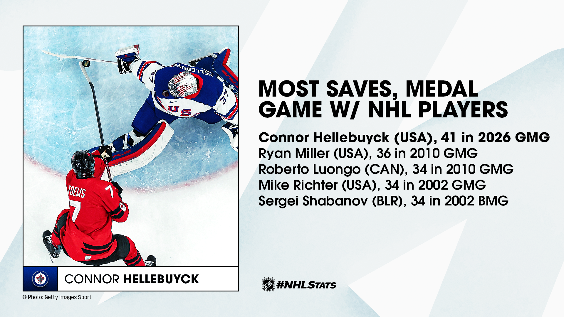 * Hellebuyck (.956 SV%), who helped Team USA defeat Team Canada in any knockout game during the Winter Olympics with NHL players for the first time and became the eighth goaltender with a single-tournament save percentage of .950 or higher, is the second reigning Hart Trophy and Vezina Trophy winner to stifle the country en route to a gold medal after Dominik Hasek (24 saves) outdueled Patrick Roy and Team Canada in a shootout during the 1998 semifinals in Nagano, Japan.