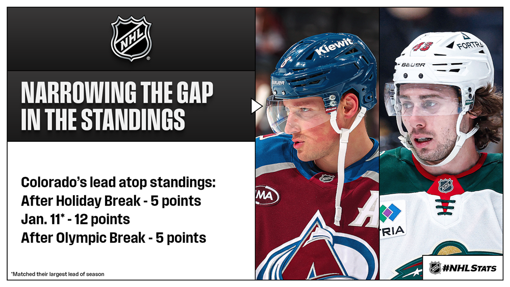 Why to Watch: In a contest that features nine medal winners (USA: 4, CAN: 3 & FIN: 2), the Wild sit within five points of the Avalanche for the No. 1 seed in the NHL, Western Conference and Central Division standings. The five-point advantage Colorado has over Minnesota (as well as CAR & TBL in the overall standings) is the closest any team has been to the Avalanche since the holiday break (DAL was 5 points back of COL on Dec. 23).