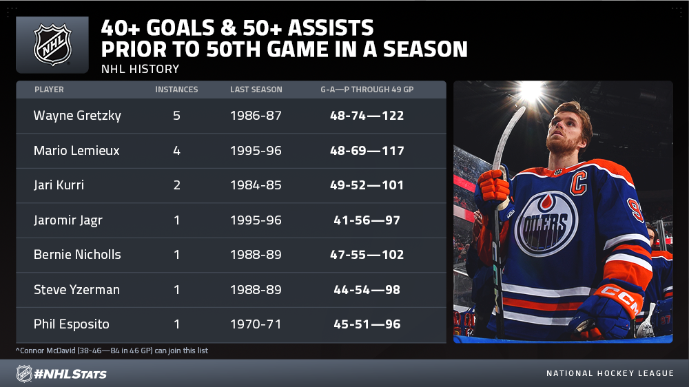 * McDavid is one point shy of 85 on the season and would be the fastest NHL player to reach the mark since Penguins teammates Mario Lemieux (34-52—86 in 32 GP) and Jaromir Jagr (36-51—87 in 42 GP) in 1995-96. Kucherov (25-63—88 in 57 GP) required 57 contests to hit 85 during his franchise-record 128-point campaign in 2018-19 (the point totals listed for Lemieux, Jagr & Kucherov are through the game where they reached the 85-point mark).