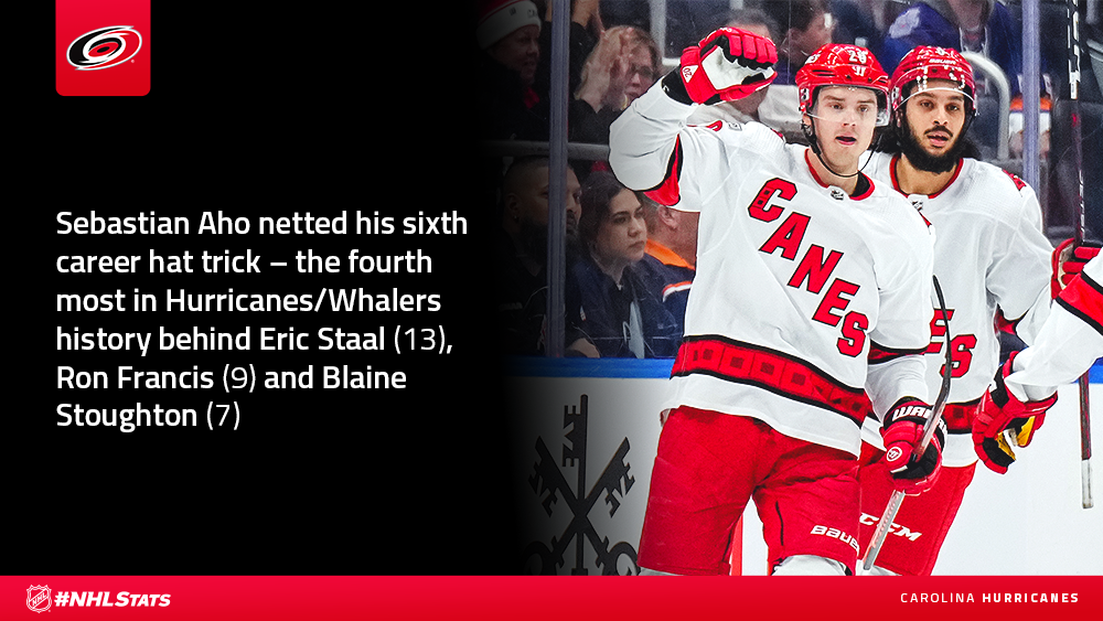 * Aho (199-242—441 in 484 GP), who moved within one goal of becoming the sixth player to score 200 with the Hurricanes/Whalers franchise, ranks sixth among Finnish-born players in NHL history with six career hat tricks behind Jari Kurri (23), Teemu Selanne (22), Patrik Laine (10), Tomas Sandstrom (8) and Olli Jokinen (7).
