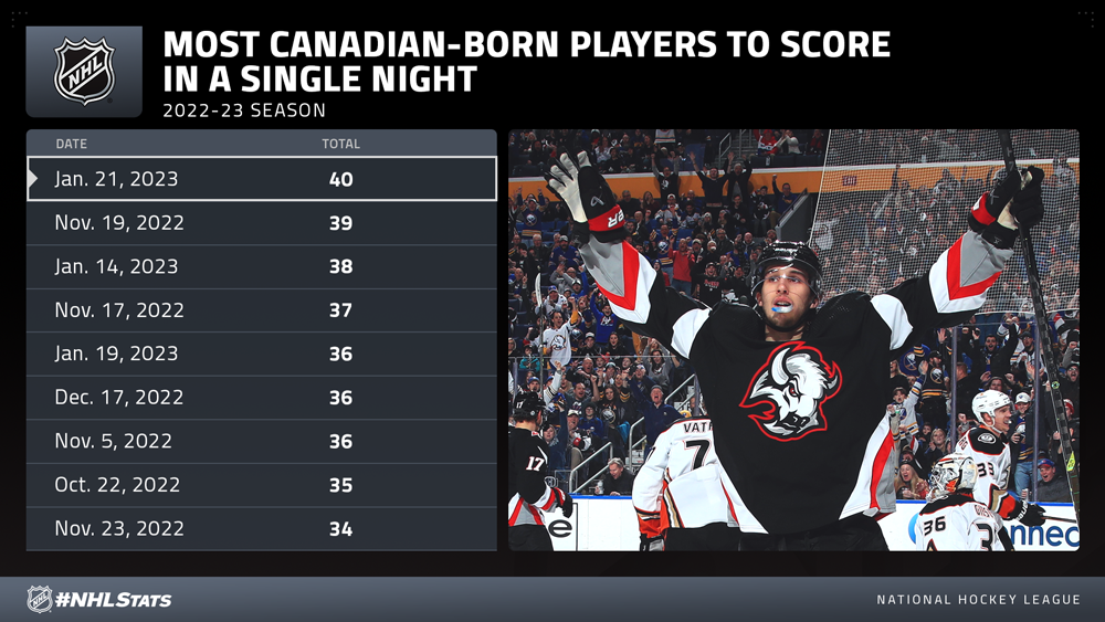 Storylines were aplenty during the 23rd annual Scotiabank Hockey Day In Canada, including Connor McDavid (40-48—88 in 48 GP) scoring his NHL-best 40th goal of the season to help the Oilers (27-18-3, 57 points) extend the League’s longest active win streak to six games. He required the fewest contests by an active player to reach the mark in a campaign, besting Auston Matthews (49 GP in 2021-22).