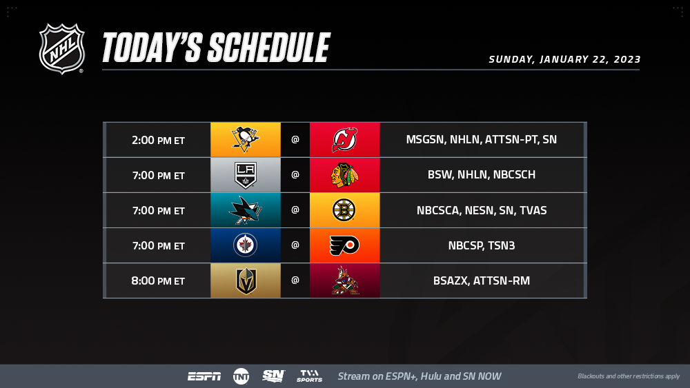 Sunday’s five-game slate is highlighted by a Sportsnet doubleheader with the Penguins (23-15-7, 53 points) visiting the Devils (29-12-4, 62 points) at Prudential Center and the League-leading Bruins (36-5-4, 76 points) hosting the Sharks (14-24-9, 37 points) at TD Garden.
