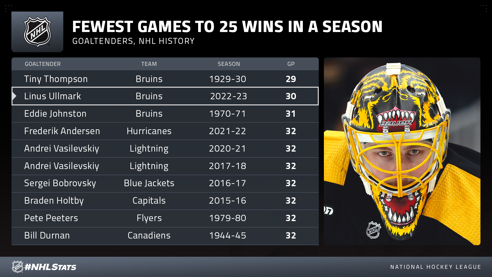 * Ullmark improved to 25-2-1 and ranks as the NHL leader in wins, save percentage (.938) and goals against average (1.82) among all goaltenders (min. 5 GP). The Bruins netminder, who made his League debut with the Sabres in 2015-16, is set to appear in his first NHL All-Star Game.