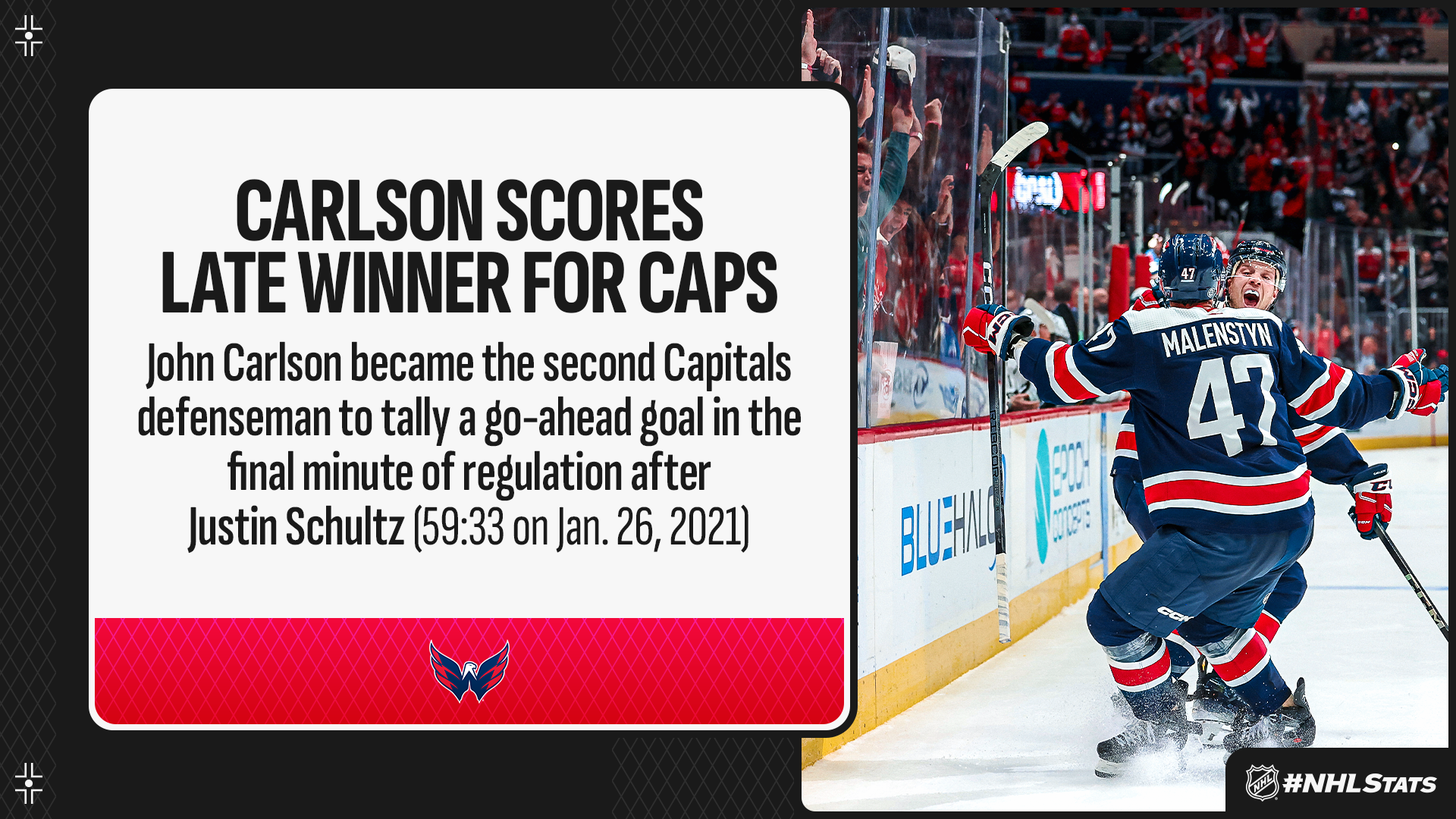 * Two days after collecting his 500th career assist, John Carlson (1-1—2)had another notable performance, this time scoring with just 53 seconds remaining in regulation to help the Capitals hand the Kings just their third regulation loss on the road this season.