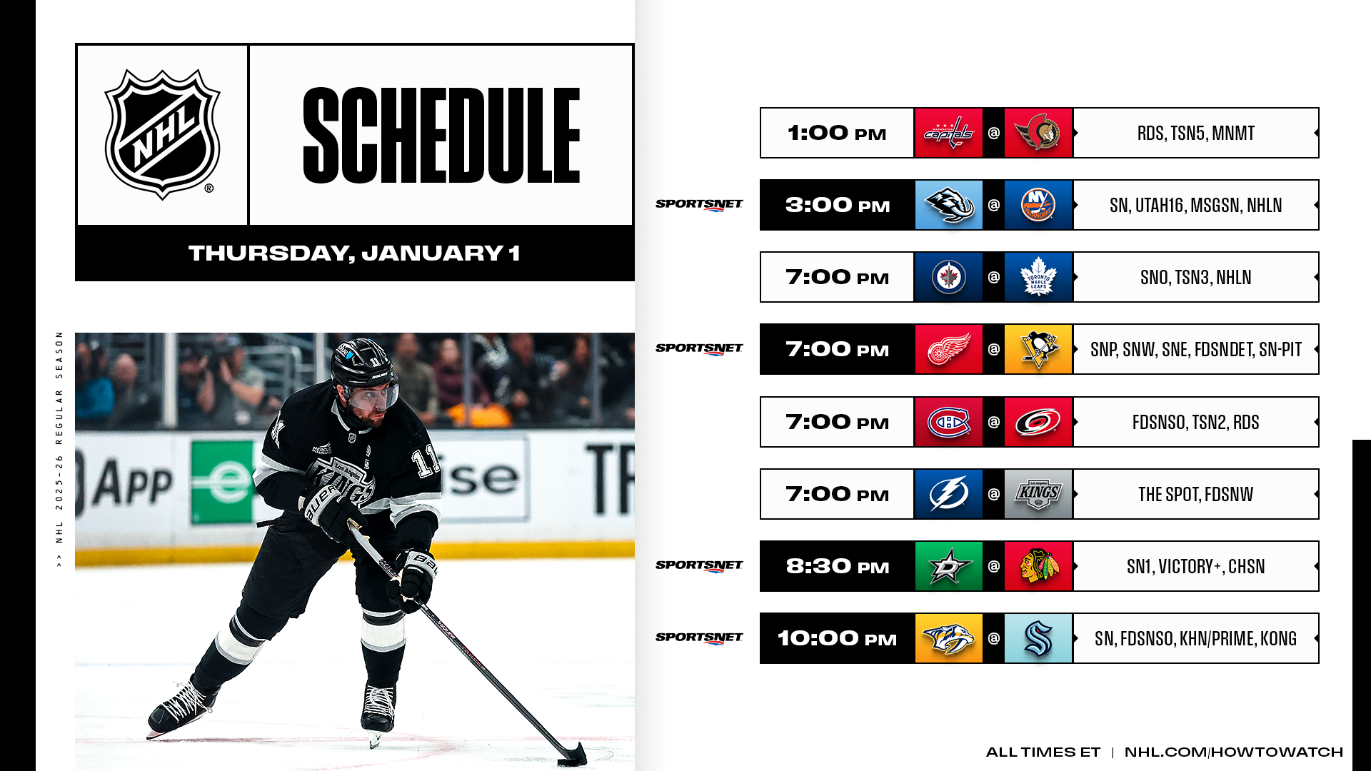 The first day of 2026 will be rung in with an eight-game slate including three national broadcasts across Canada on Sportsnet as well as Anze Kopitar within striking distance of 1,300 career points. Kopitar (446-852—1,298) can become the fifth active player to reach that milestone when the Lightning visit the Kings – should he do so, he would join Sidney Crosby, Alex Ovechkin, Evgeni Malkin and Patrick Kane.