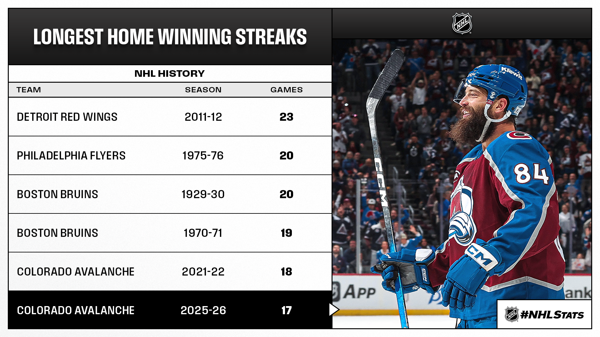 * Brent Burns (40 years, 307 days) led the Avalanche to their 17th straight win at Ball Arena with a pair of tallies and became the fourth-oldest defenseman in NHL history to record a multi-goal game, following Tim Horton (41 years, 277 days on Oct. 16, 1971), Zdeno Chara (41 years, 221 days on Oct. 25, 2018) and Nicklas Lidstrom (41 years, 191 days on Nov. 5, 2011). Colorado improved to 19-0-2 on home ice and became the 11th team in NHL history to register a point in each of their first 21 home games of a season.