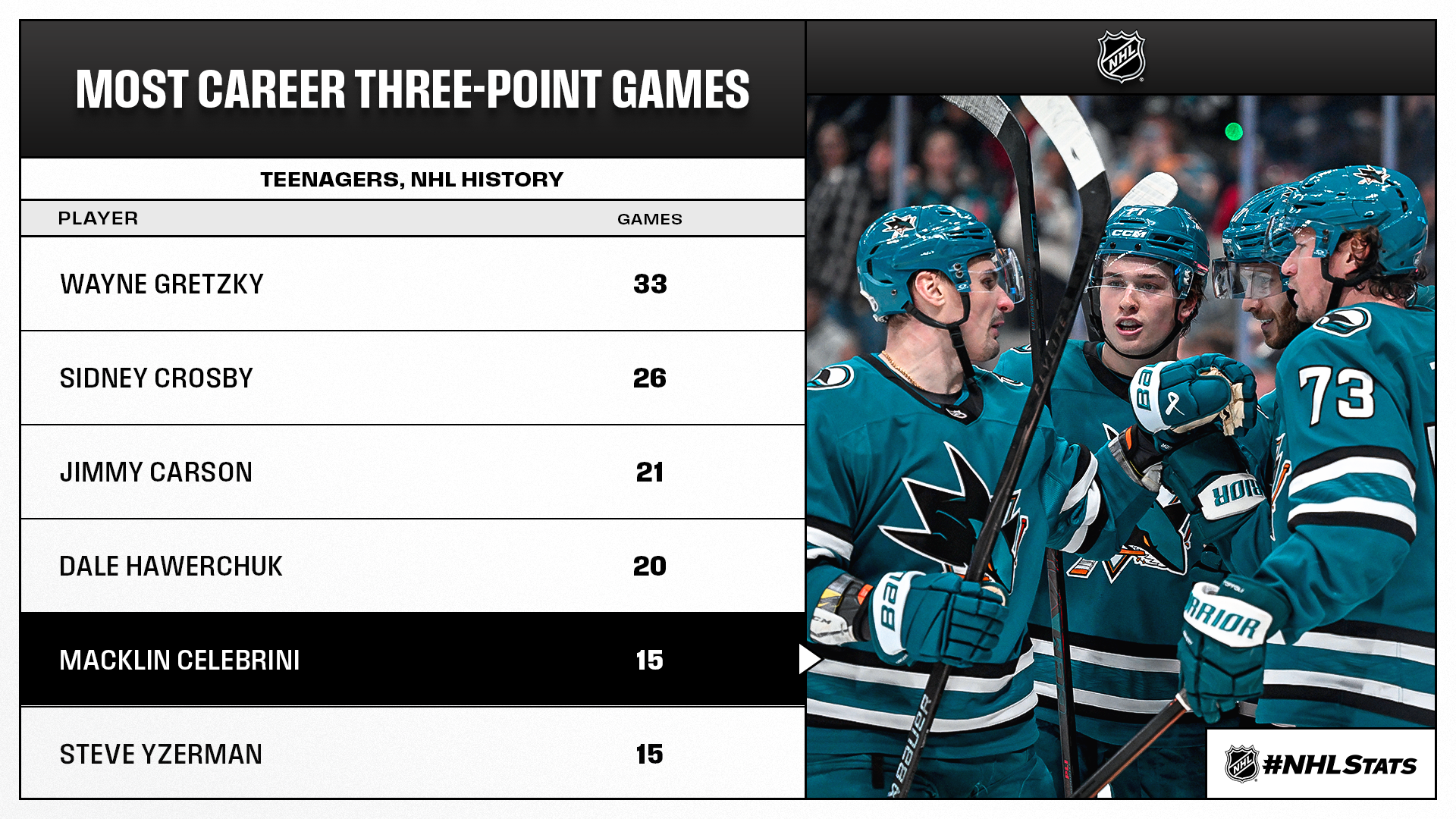 * Celebrini, who is Olympic-bound (Team Canada), became the third player to hit 70 points in 2025-26 (24-46—70 in 44 GP). In the process, he also became the third-fastest teenager in NHL history to reach the mark in a season, following Wayne Gretzky (40 GP in 1980-81) and Sidney Crosby (43 GP in 2006-07).